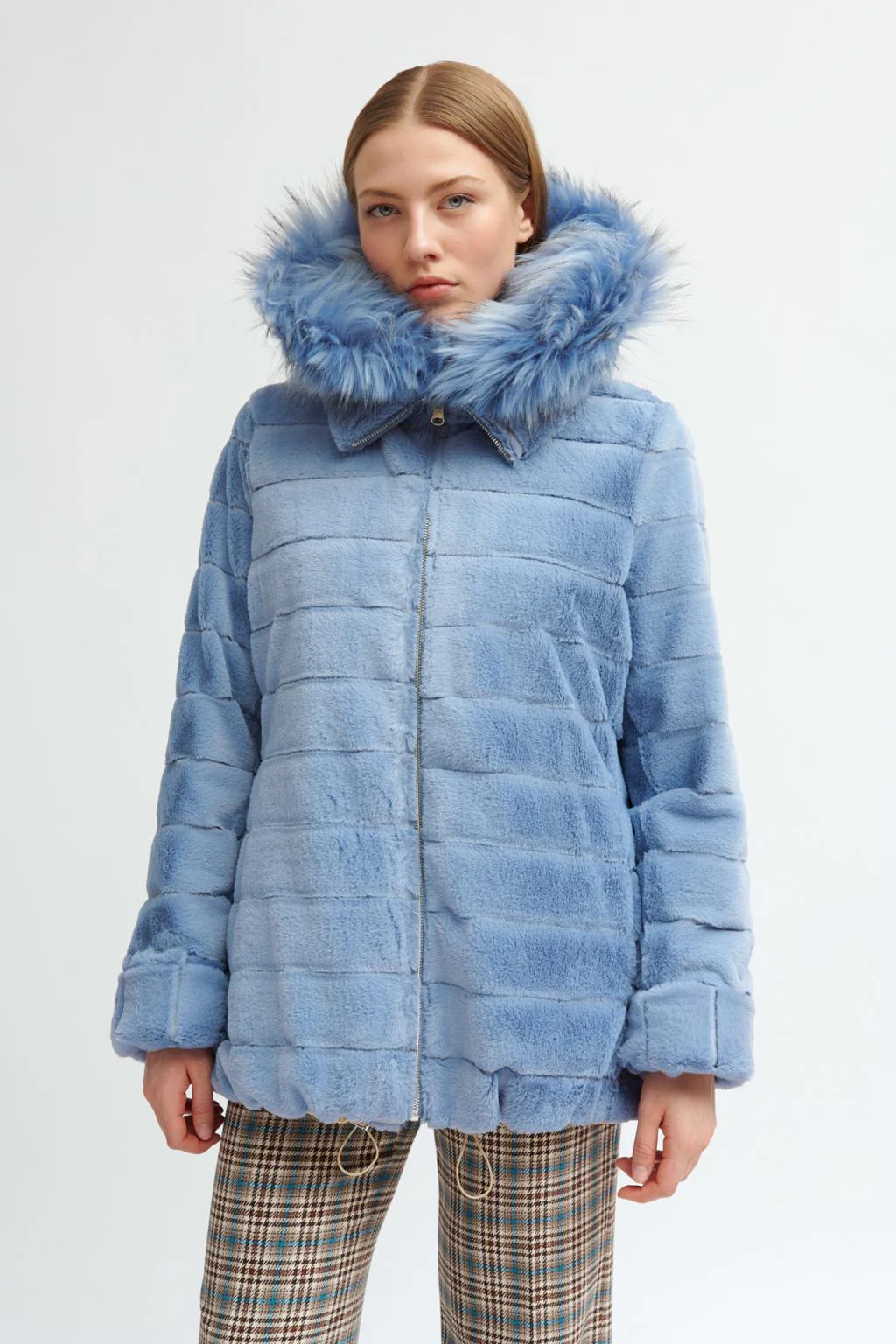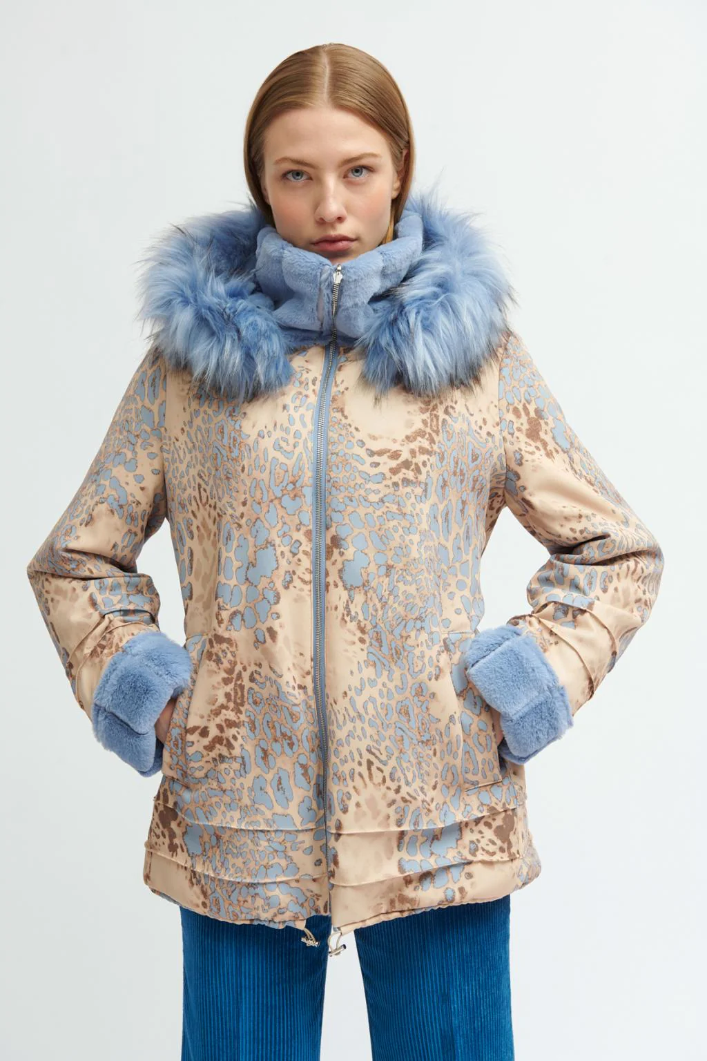 Abrigo reversible. Combinación de acolchado animal print en tonos beige y celestes, y mutón sintético monocolor en celeste. Cierre frontal con cremallera. Reguladores en bajo. Bolsillos laterales ocultos. Capucha reversible desmontable con detalle de pelo sintético. Cuello alto de mutón sintético. Puños con detalle de mutón sintético. Diseñado y fabricado en España.
