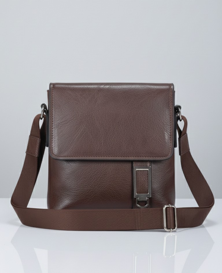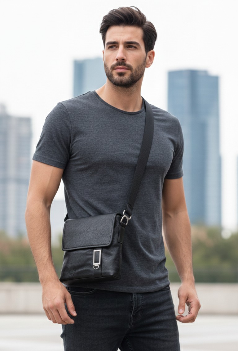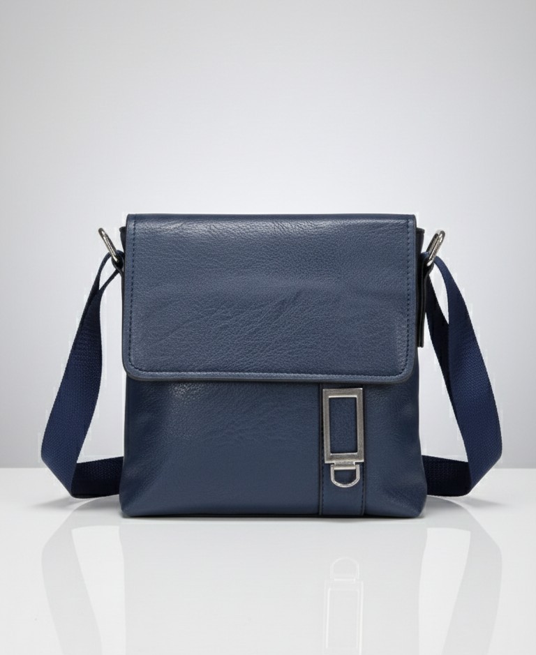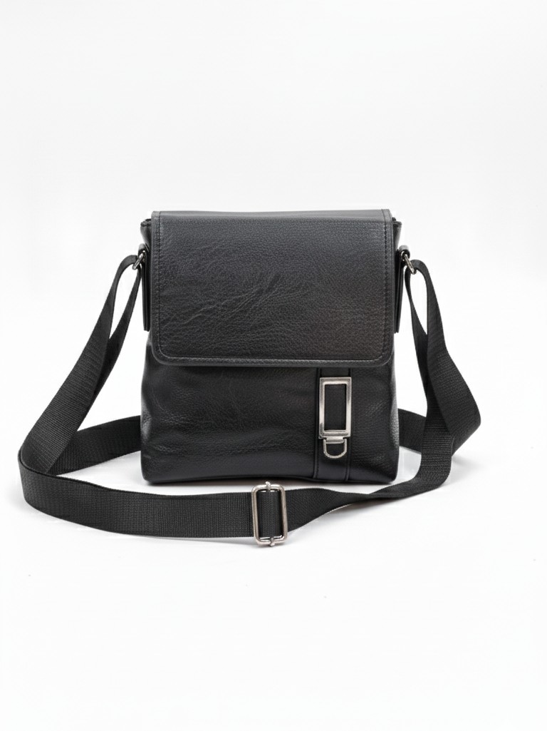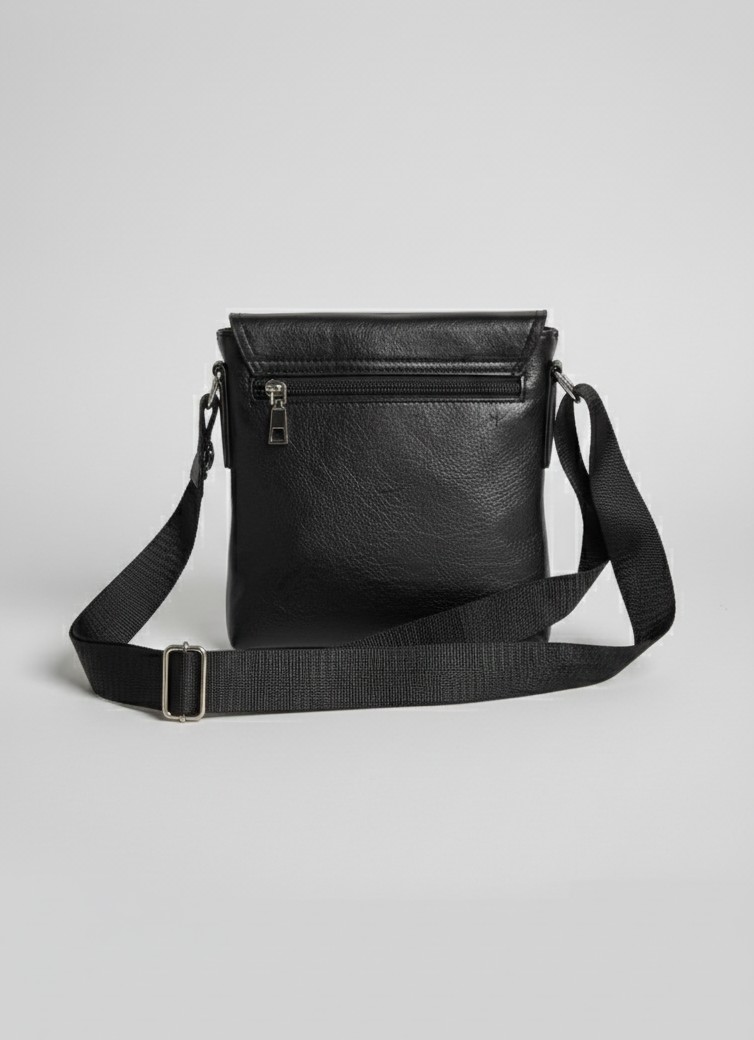 Bandolera en polipiel con detalle plateado. Compartimento con cremallera y solapa. Asas regulables. Bolsillo con cremallera en la parte trasera.