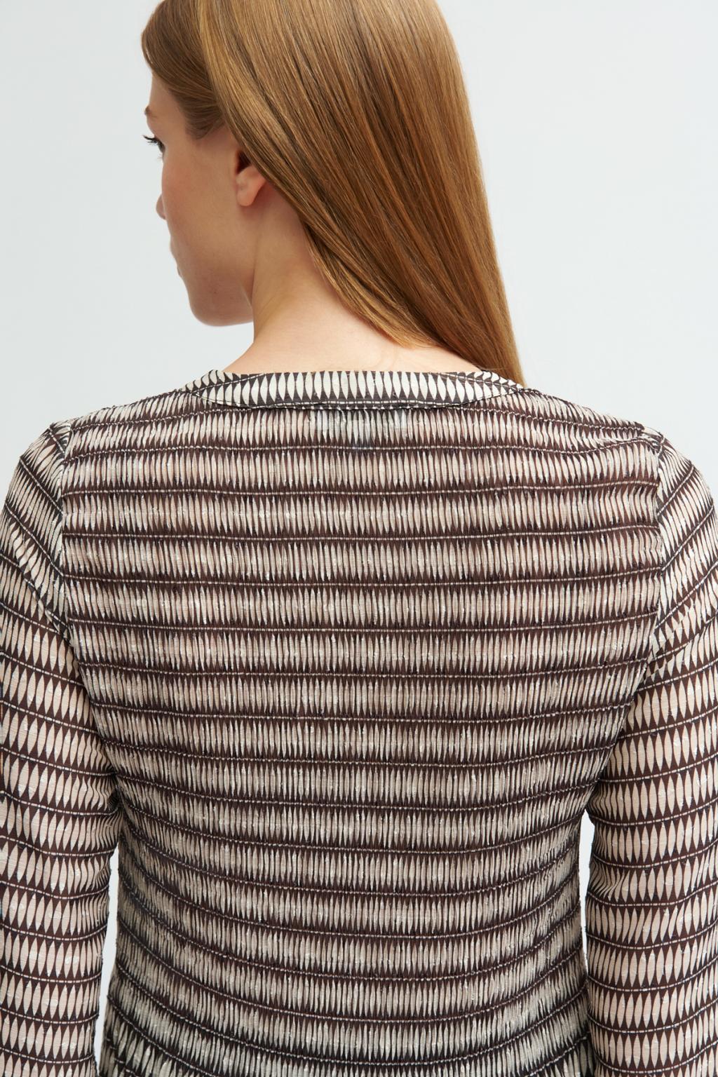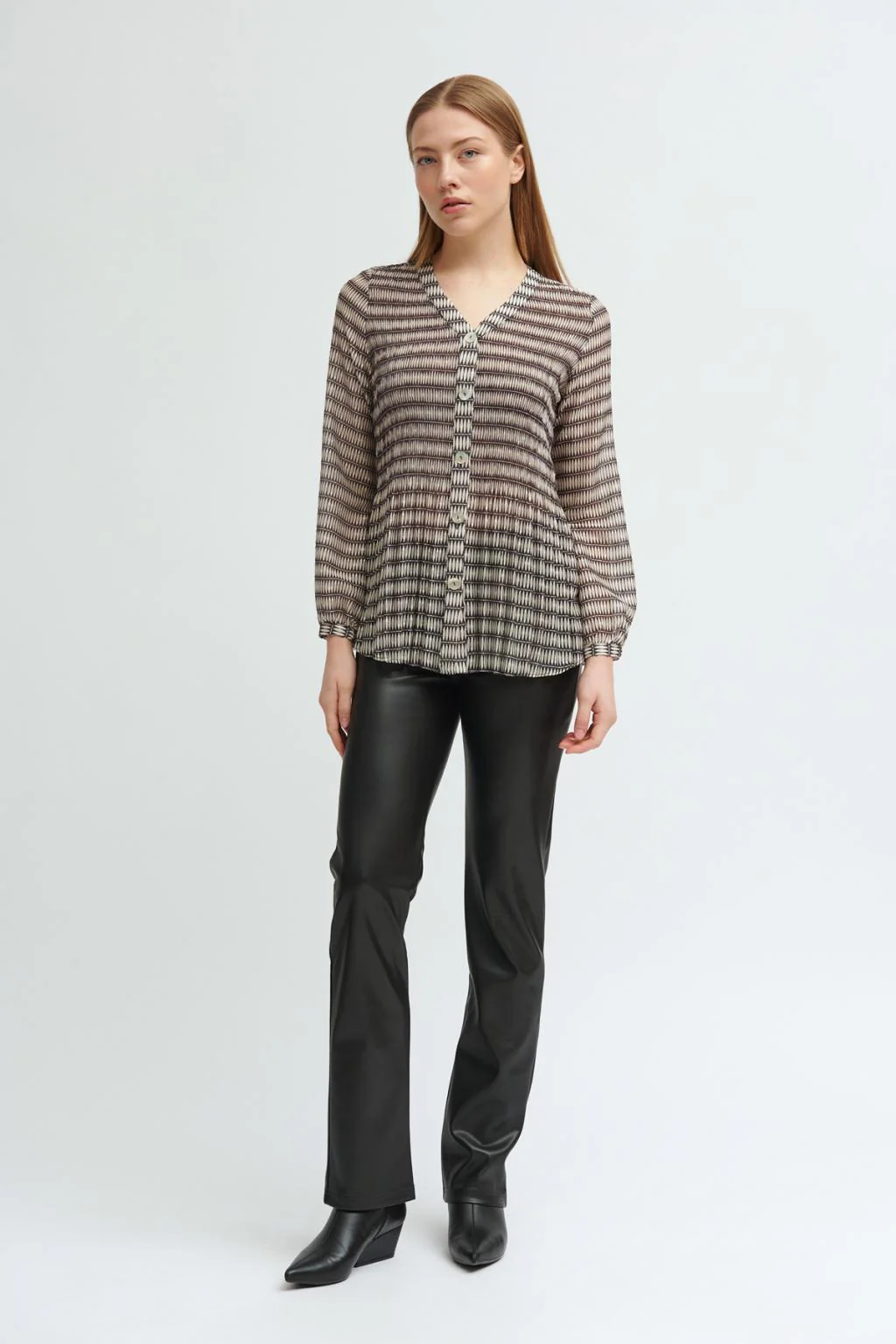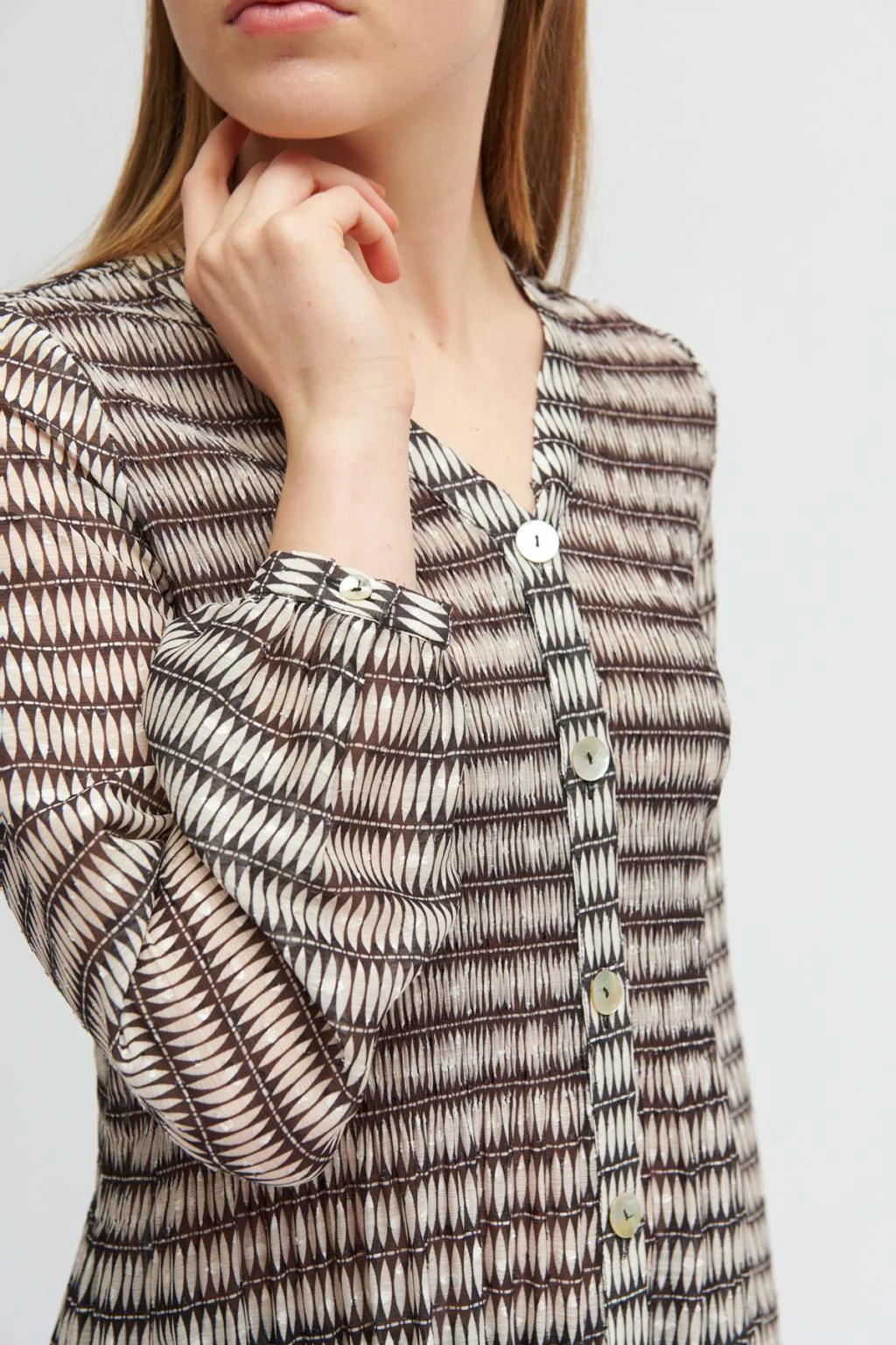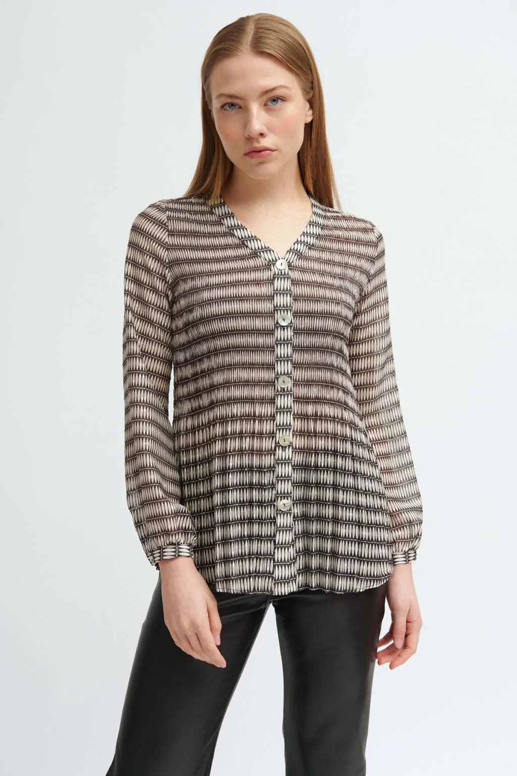 Blusa fluida plisada con estampado. Cuello en pico. Manga larga y puño con cierre de botón. Cierre frontal con botones efecto nácar al tono. Diseñada y fabricada en España.