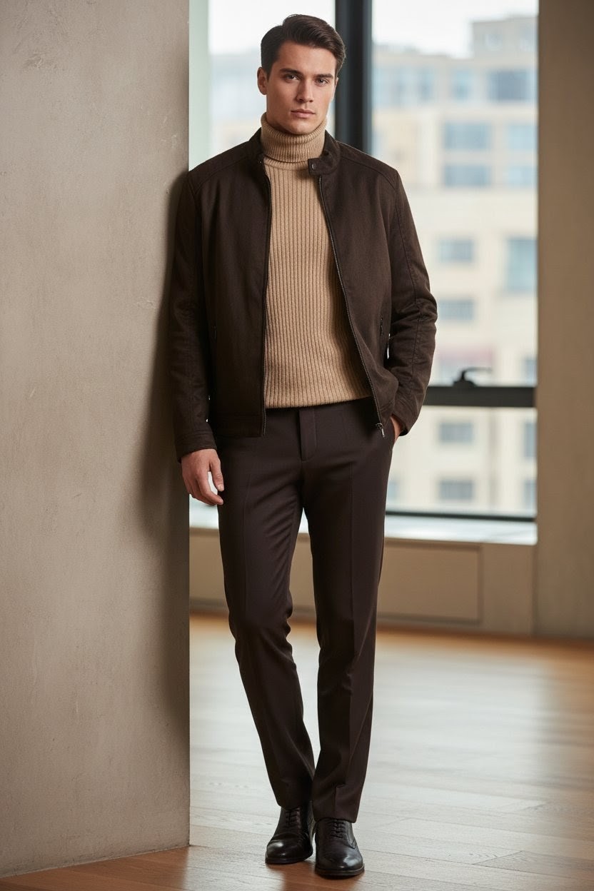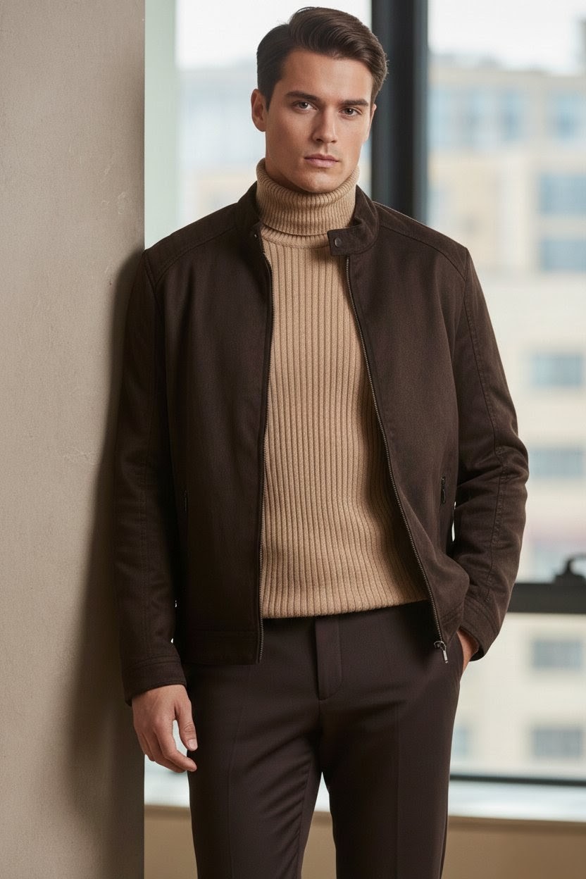 Cazadora de ante en color marrón chocolate corta con cremallera. Interior enguatado.