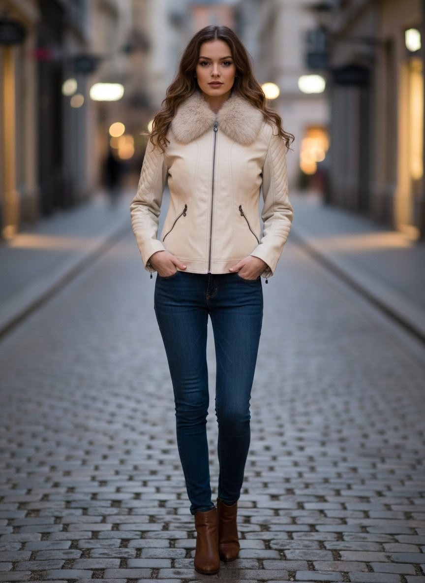 Cazadora polipiel corta cuello pelo beige