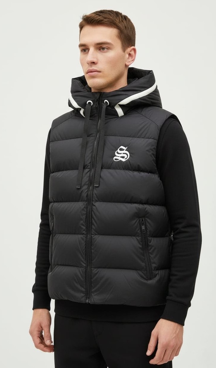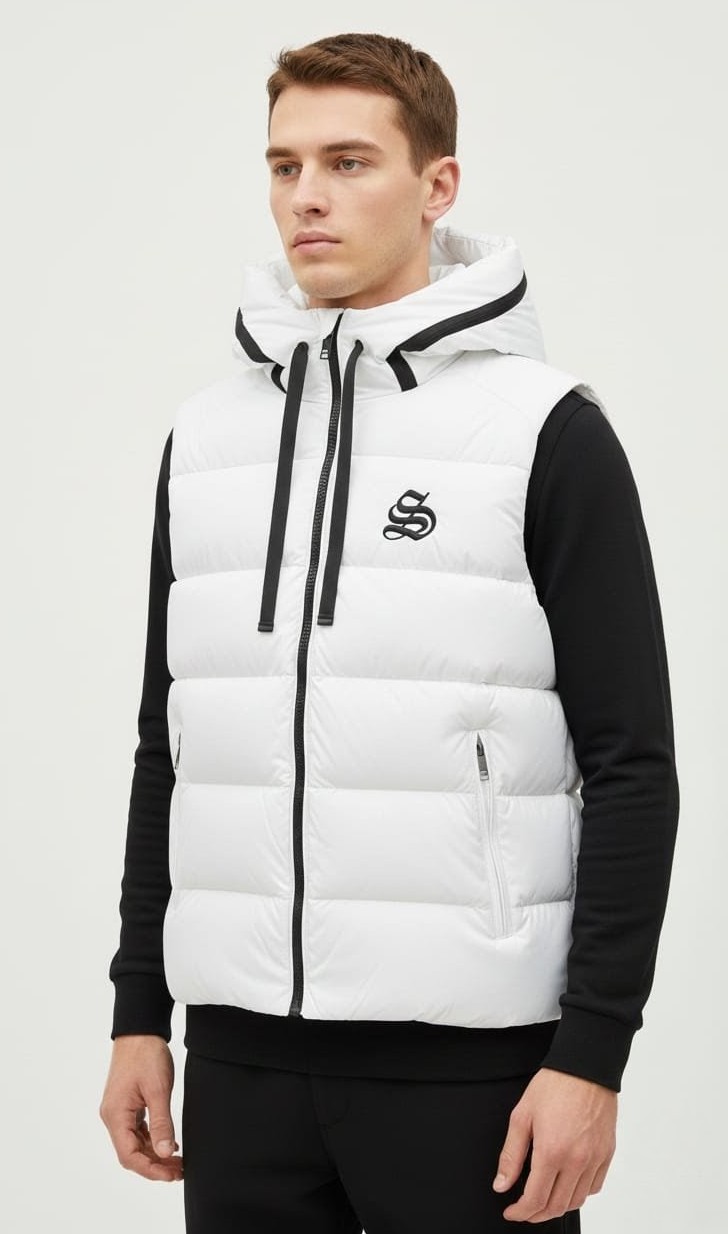 Chaleco enguatado gordo con capucha. Capucha con detalle cremallera letras.
