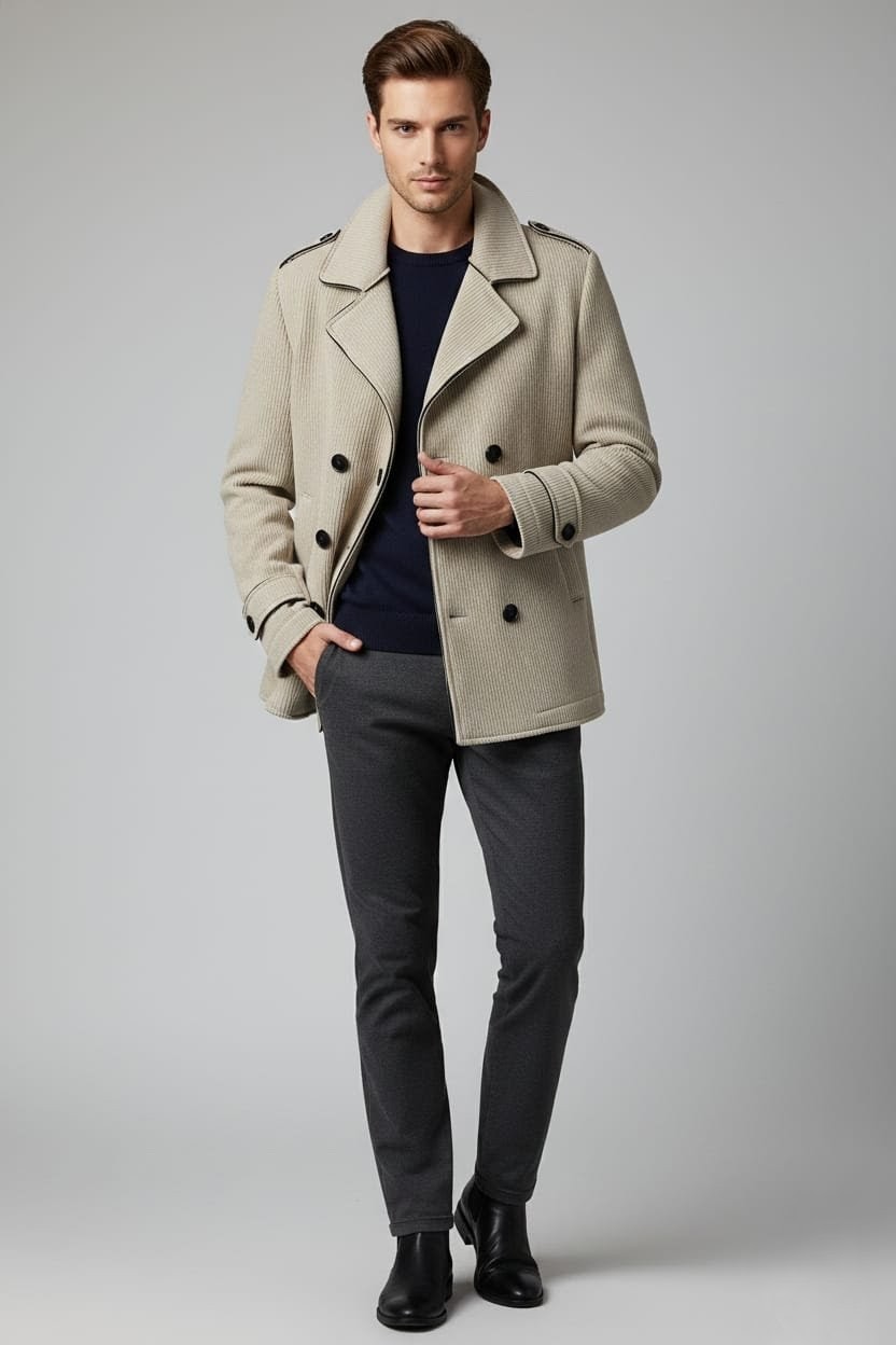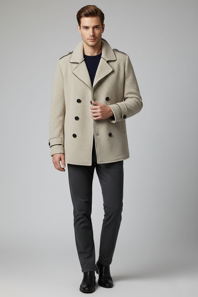 Chaqueta cruzada de tejido neopreno imitación pana en color beige y detalle de botones en azul marino. Tejido gordo.