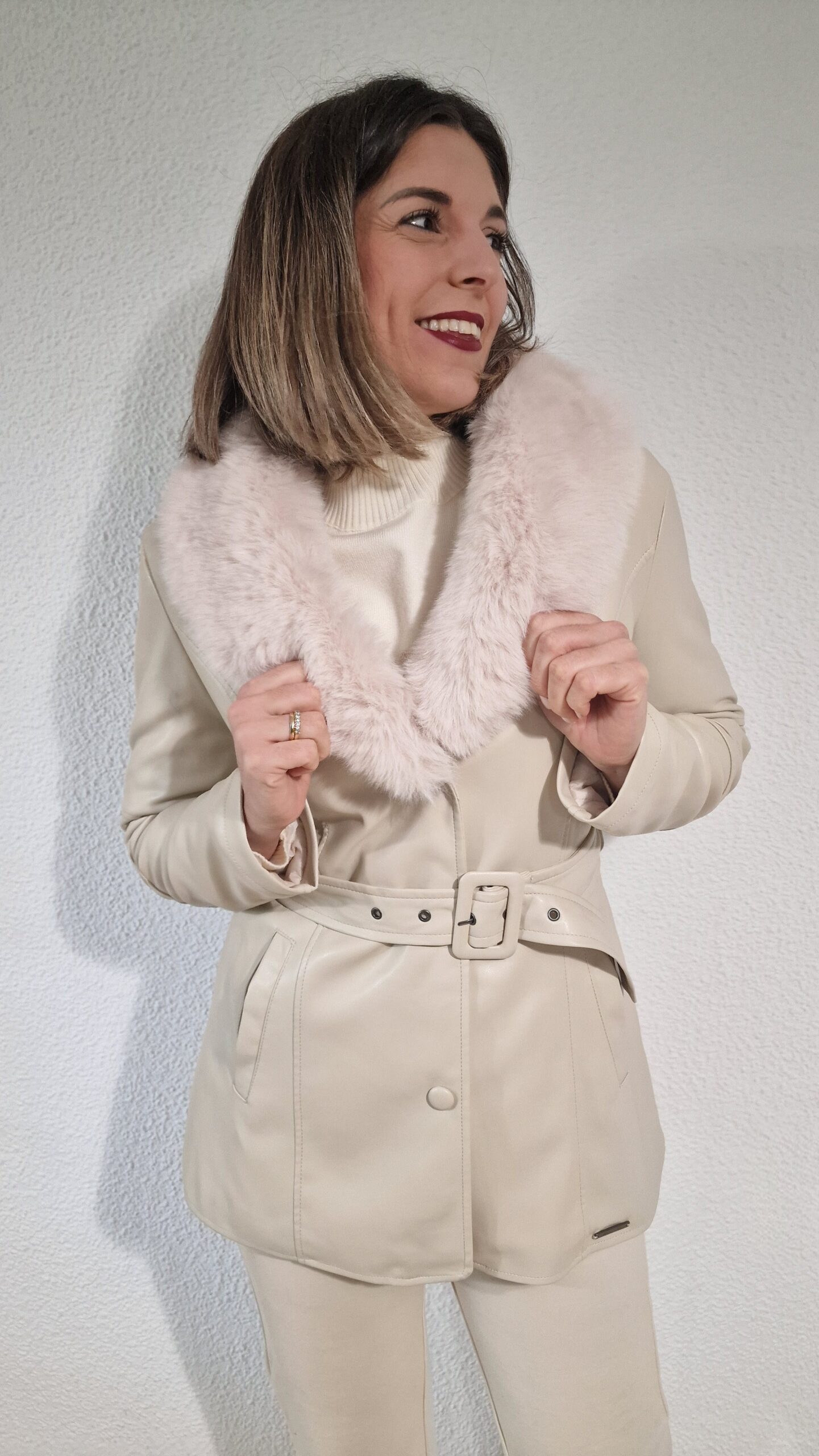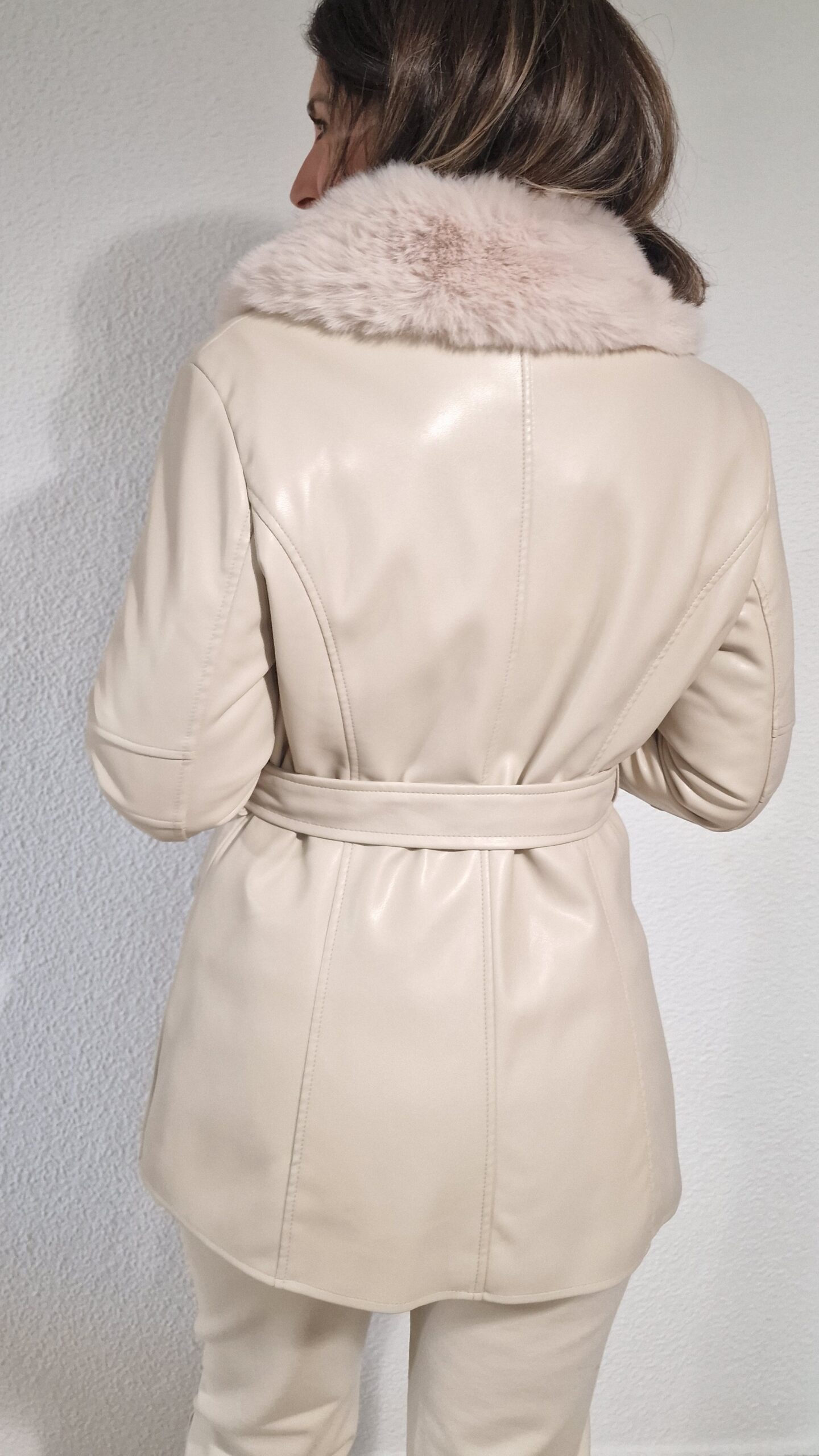 Chaquetón polipiel tres cuartos cuello pelo con cinturón beige