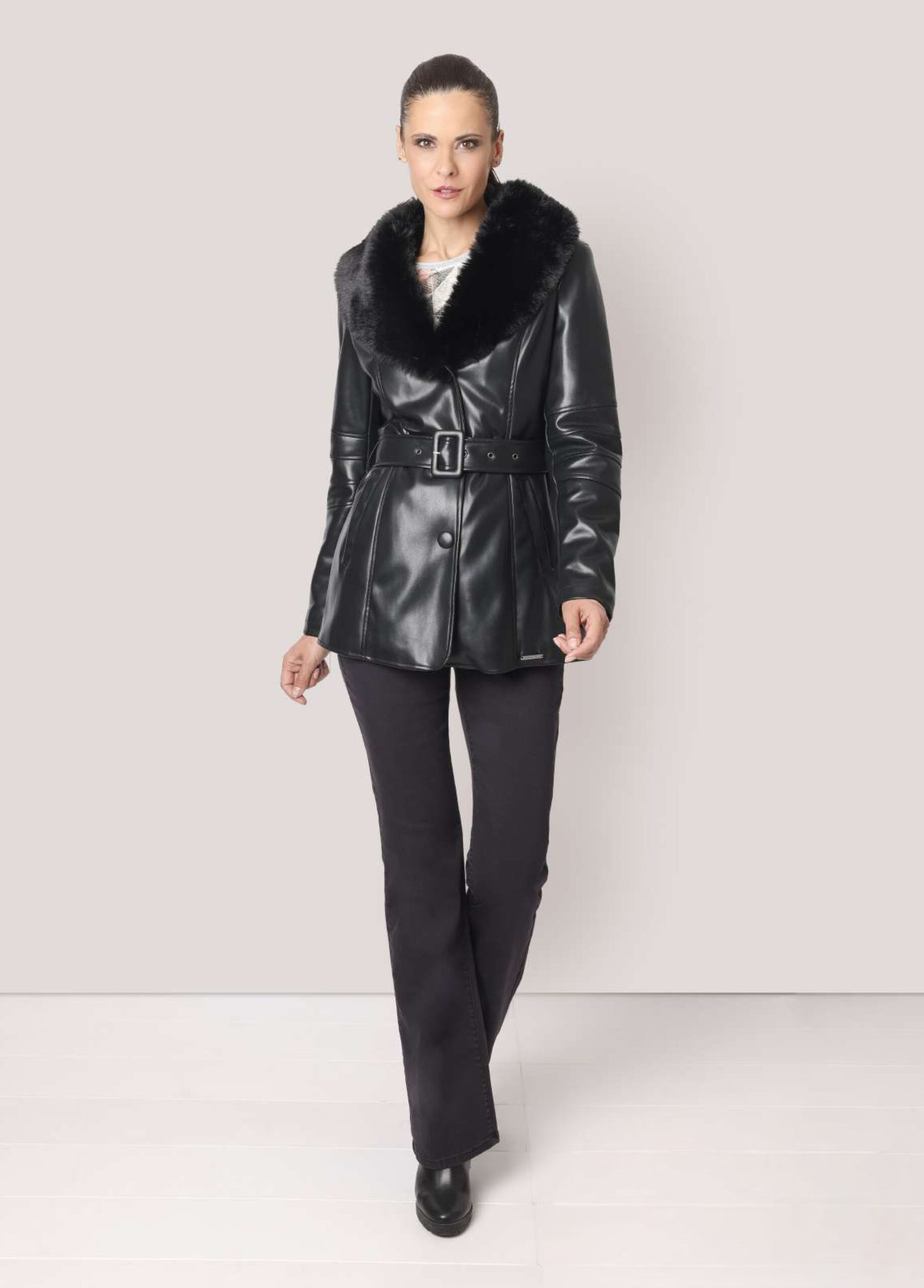 Chaquetón polipiel tres cuartos cuello pelo con cinturón negra