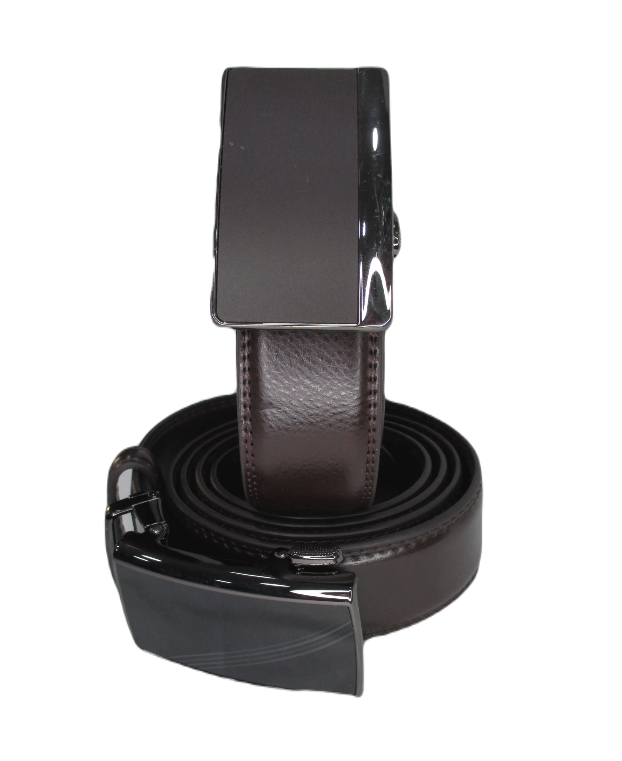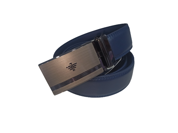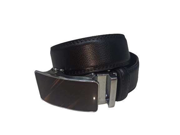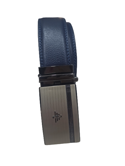 Cinturón de polipiel con hebilla rectangular de clic. No tiene agujeros, se engancha con un mecanismo tipo brida por la parte trasera del cinturón. Se puede quitar el cabezal para cambiarlo o acortar la medida del cinturón en caso necesario.