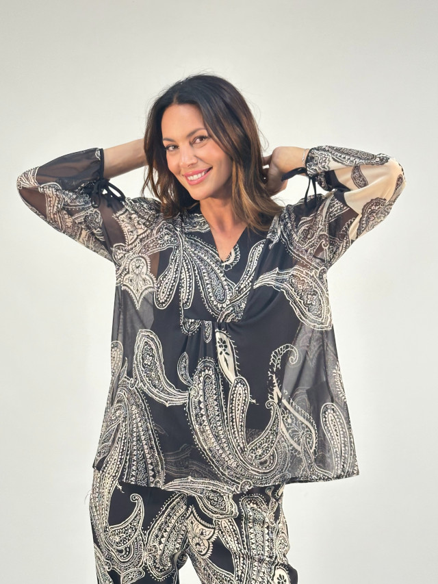 Conjunto blusa y pantalón cachemir negro y beige