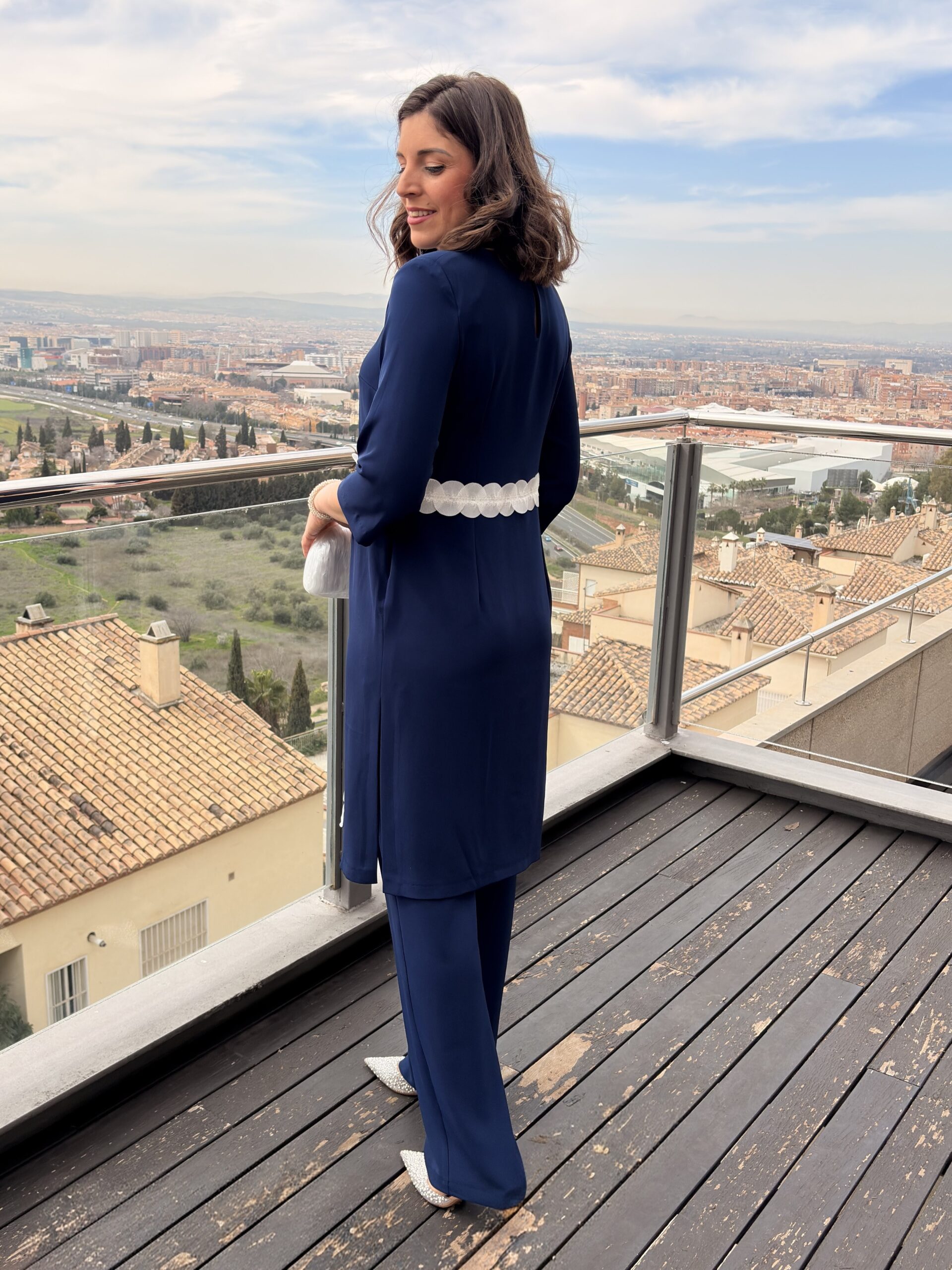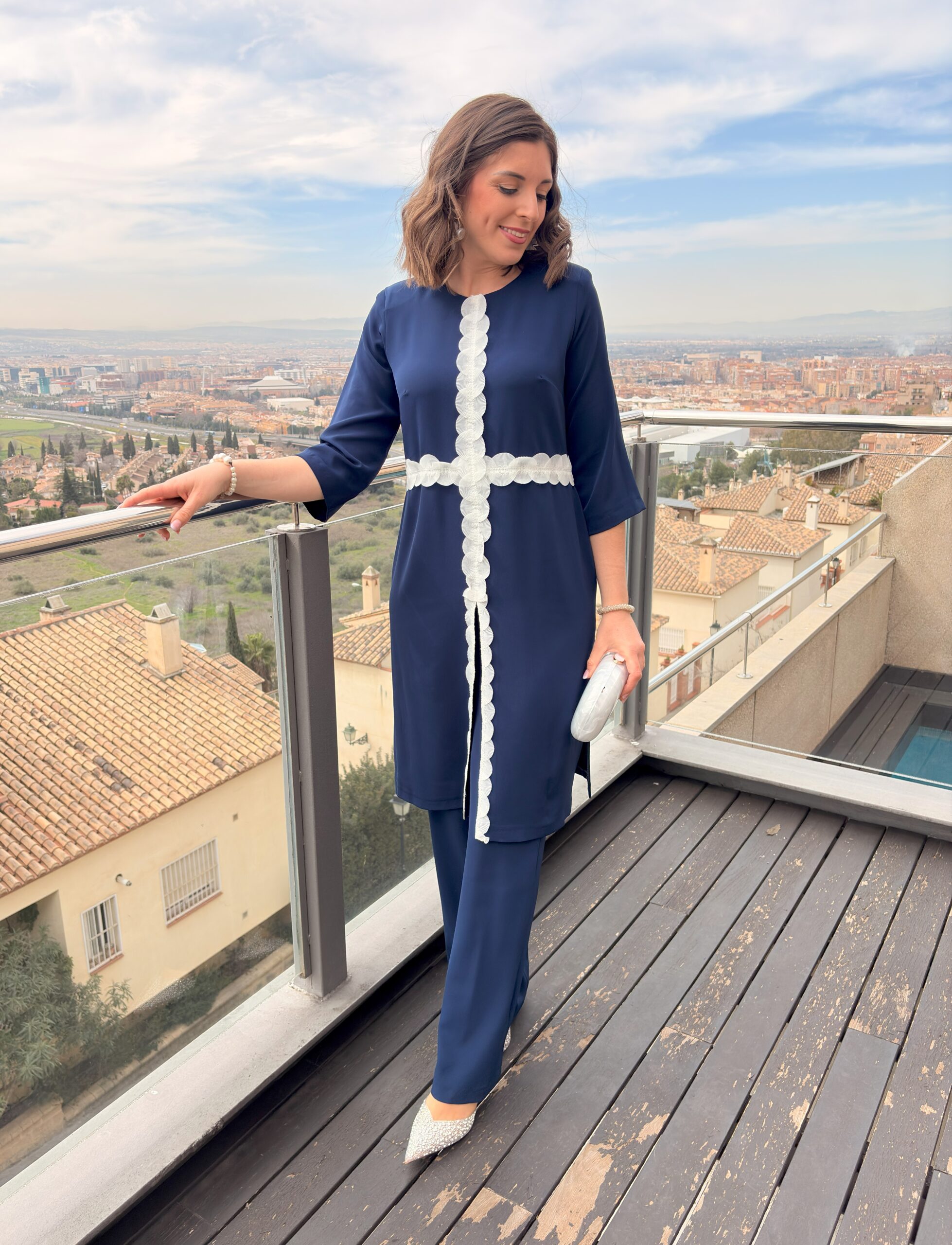 Conjunto de blusón largo con manga francesa con detalle de pasamanería en forma de cruz. Abertura frontal en la parte baja. Detalle de pasamanería en la cintura, tanto por delante como en la espalda. Cremallera invisible en el lateral. Abertura en forma de gota en la espalda cerrada con botón superior forrado en la misma tela. Pantalón de tiro alto con cremallera lateral, de corte ancho. Disponible en color blanco con pasamanería en negro, y en azul marino con pasamanería en blanco. Diseñado y fabricado en España.