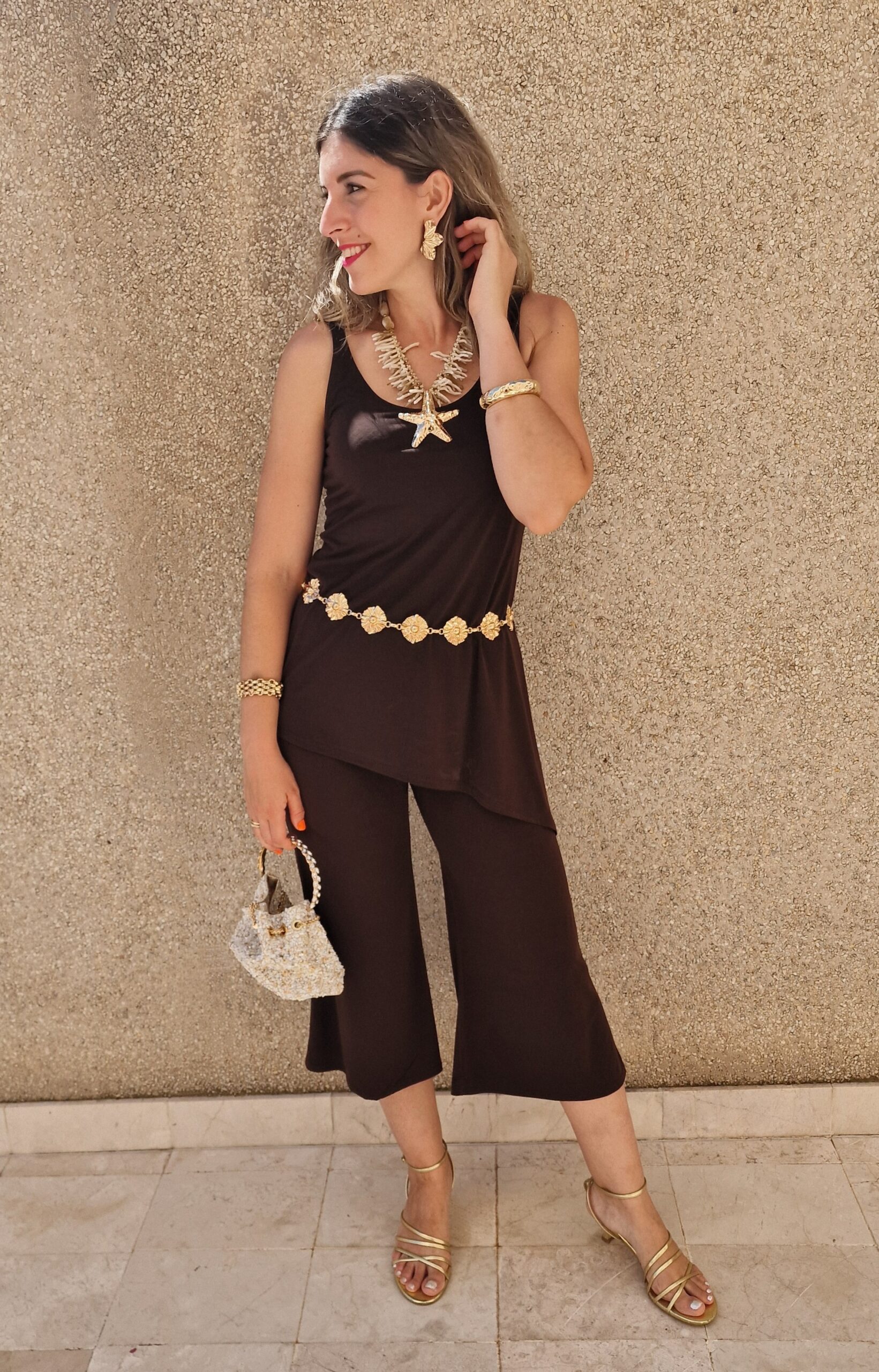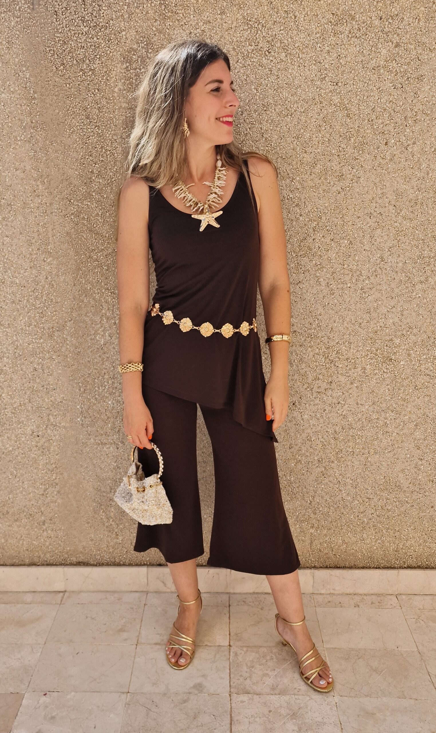 Conjunto top asimétrico y pantalón marrón chocolate