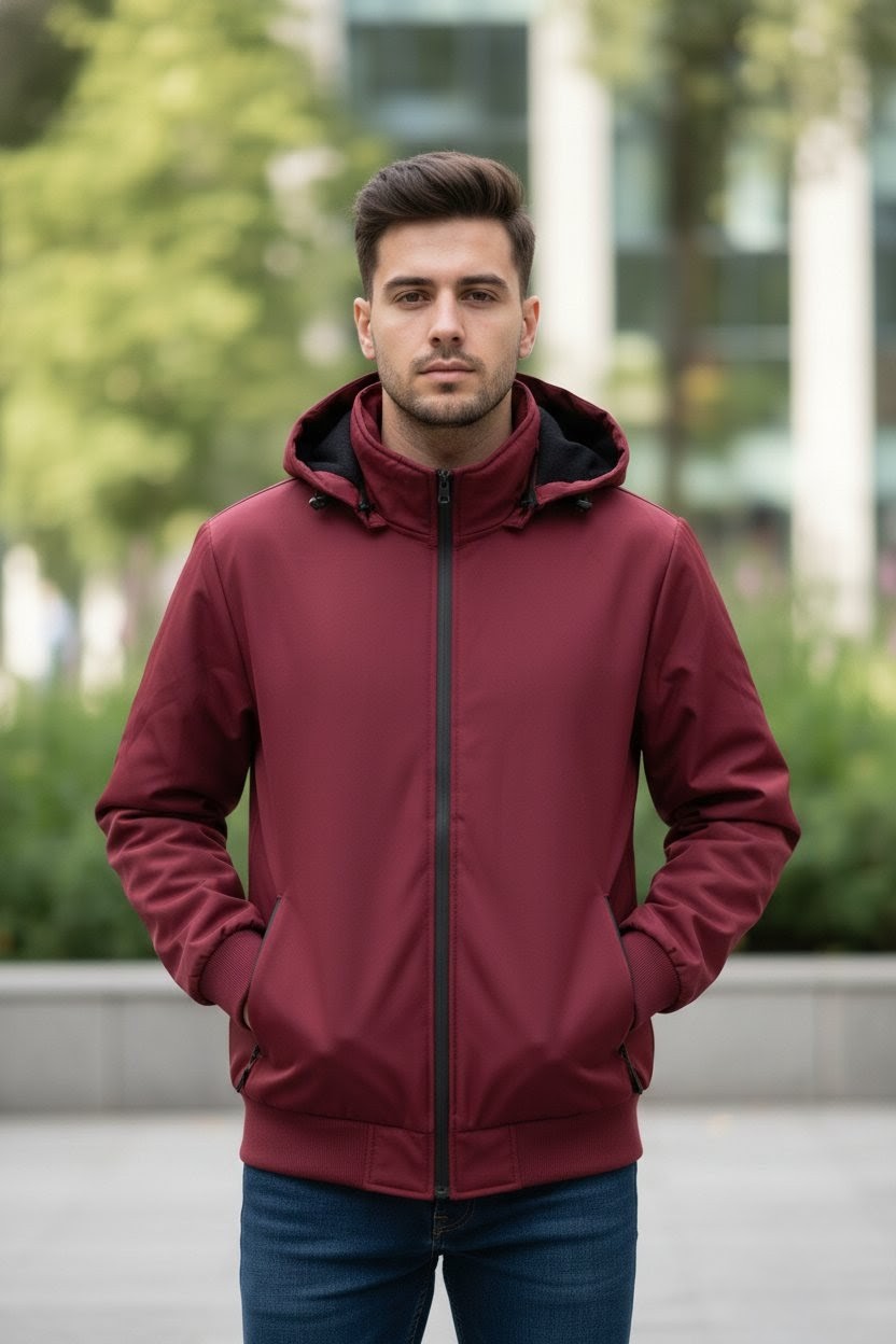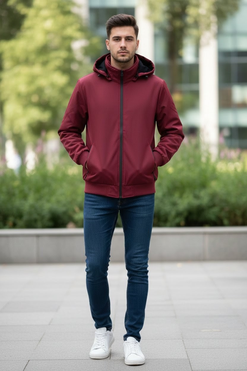 Cortavientos burdeos con capucha desmontable. Interior de forro polar.
