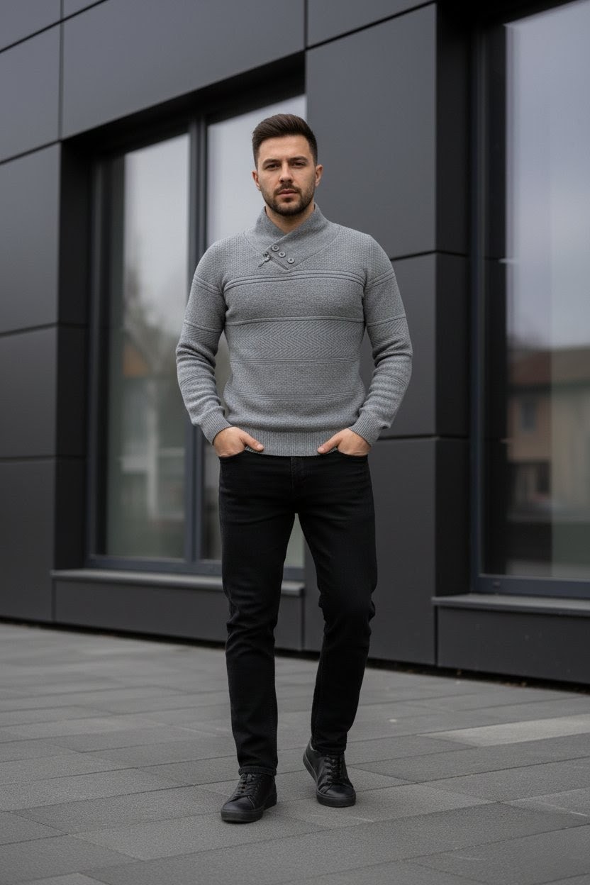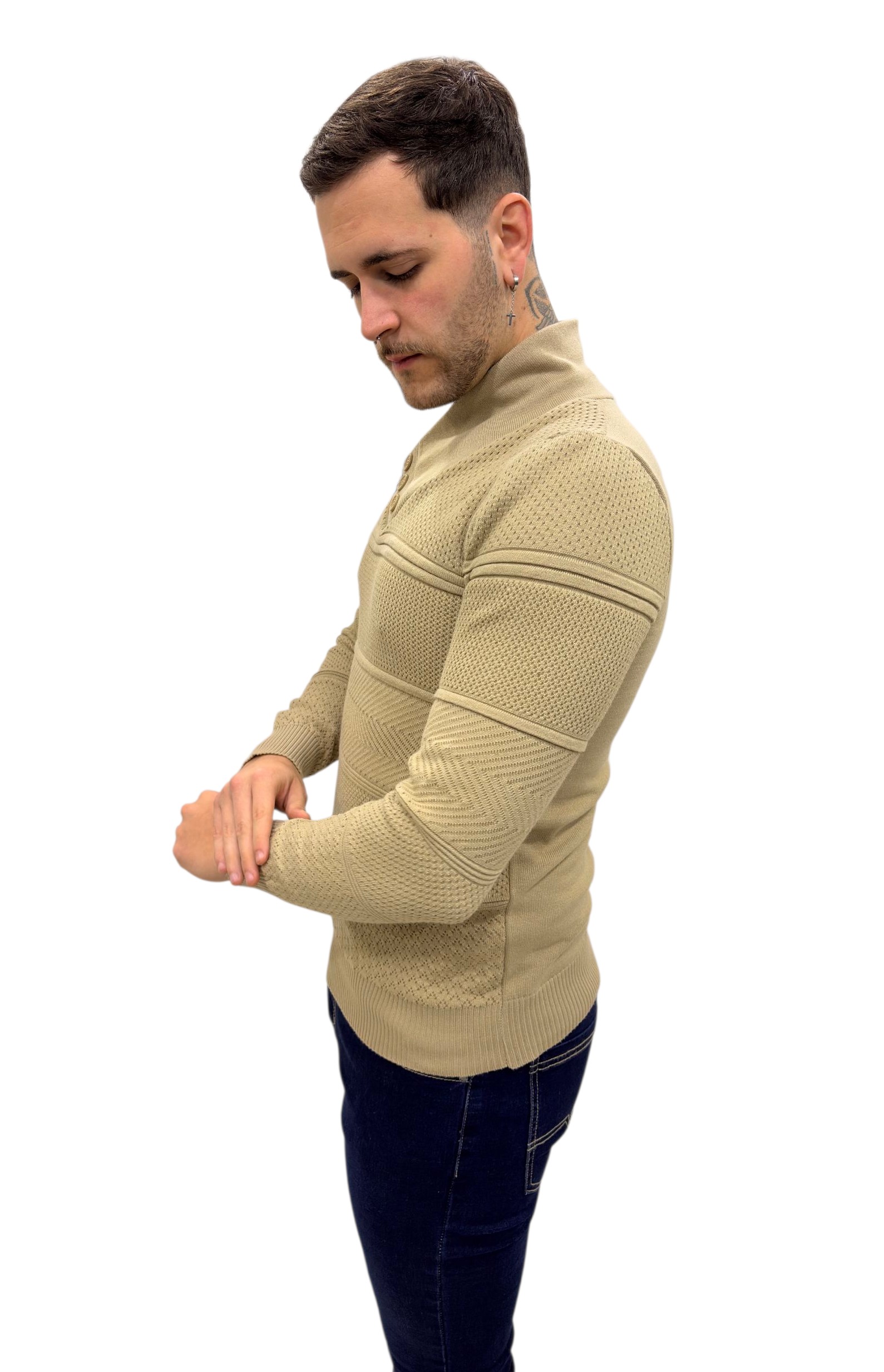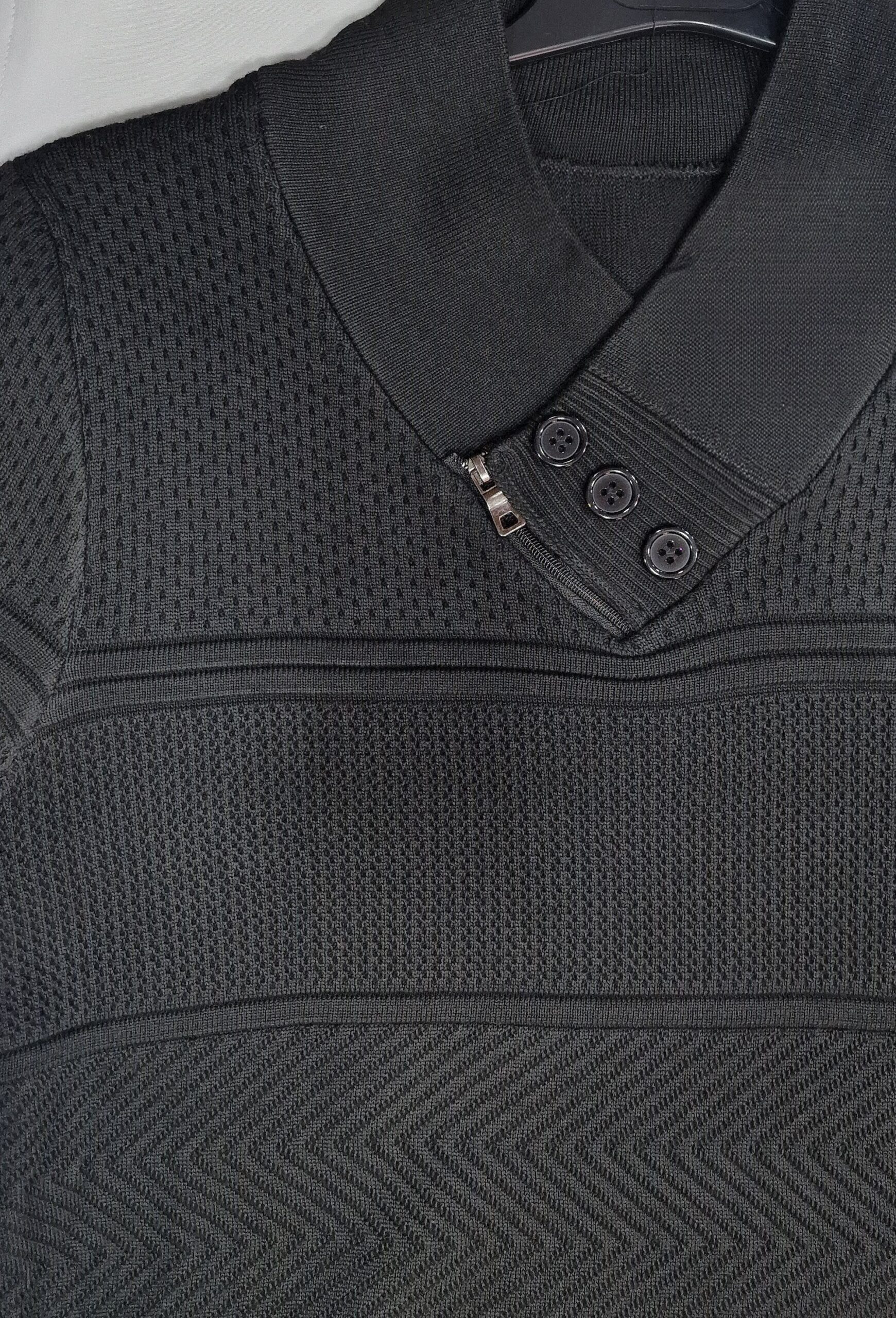 Jersey de punto fino con cuello cruzado. Detalle de botones y cremallera en el cuello. Tejido con estructura y franjas. Este producto talla muy pequeño. Se aconseja coger una talla más de la que se suele usar para un ajuste entallado y dos tallas más para un ajuste normal.
