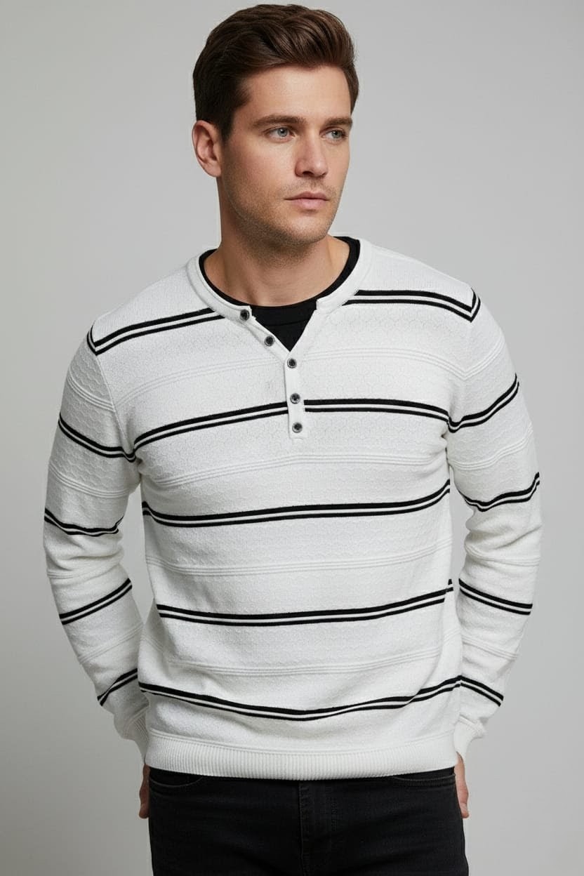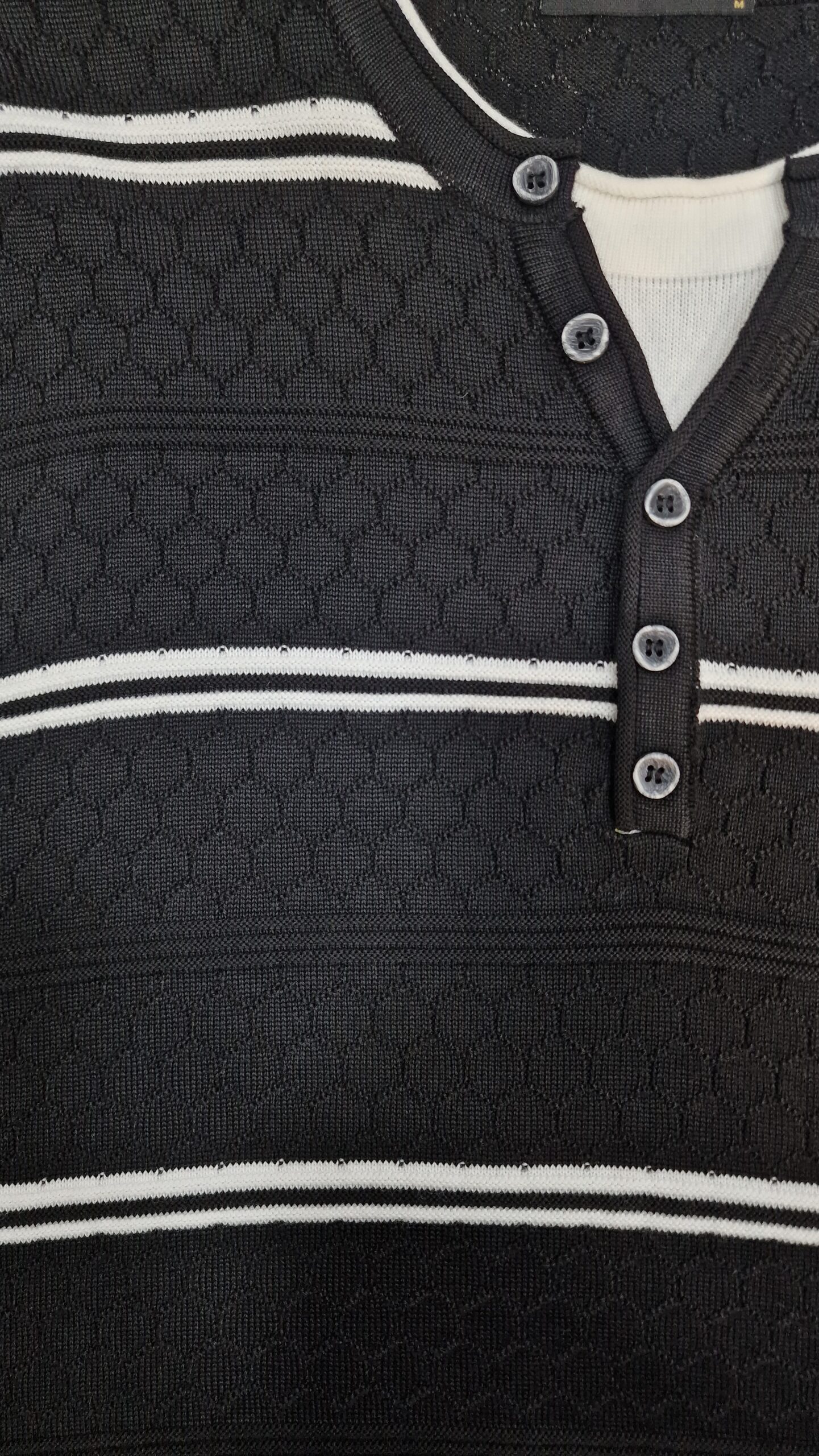 Jersey de punto fino con detalle de falso filo de camiseta interior. Cuello abierto con botones. Tejido con estructura y rayas. Este producto talla más pequeño de lo habitual. Se aconseja coger una talla más de la que suele usar.