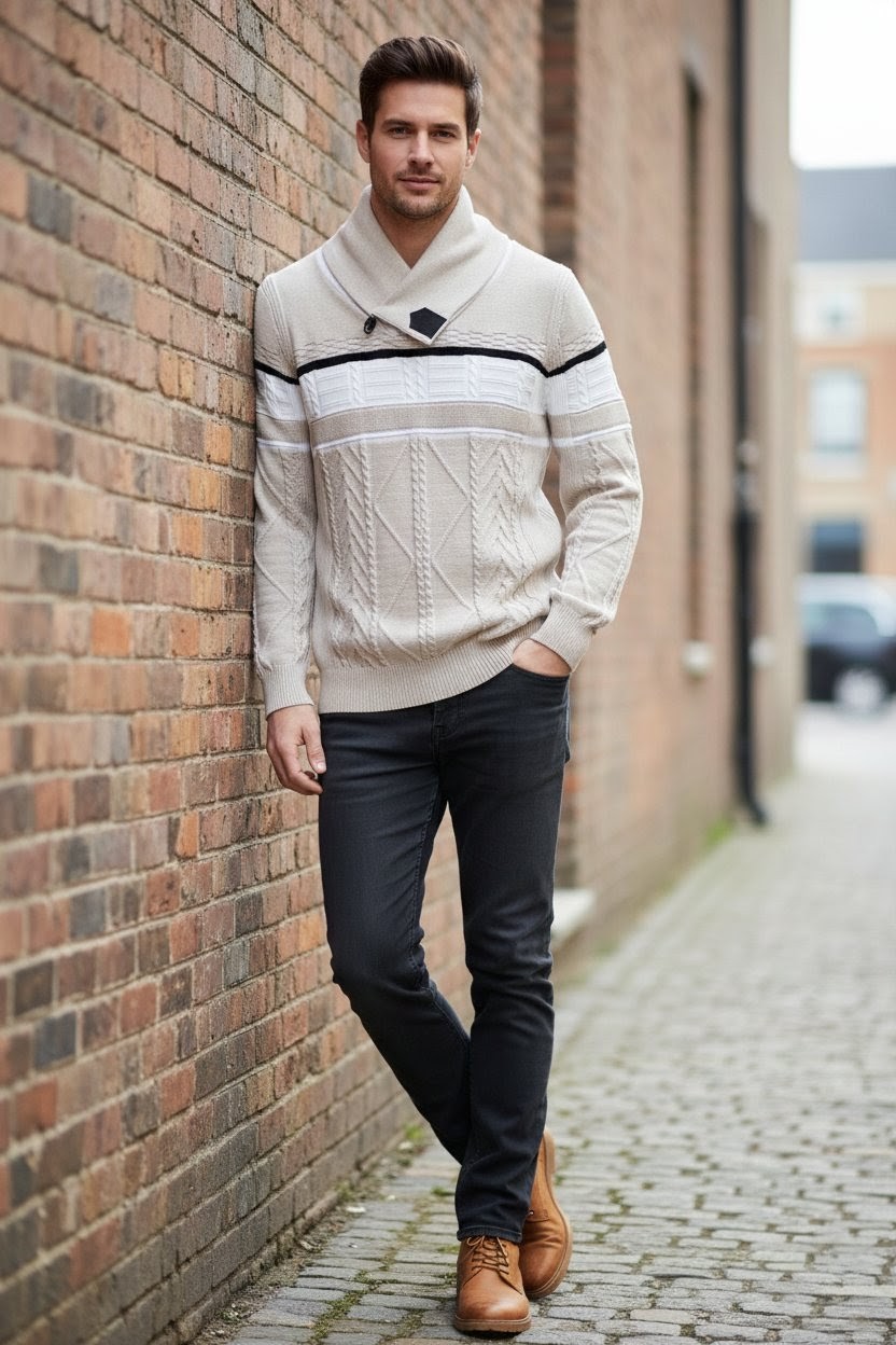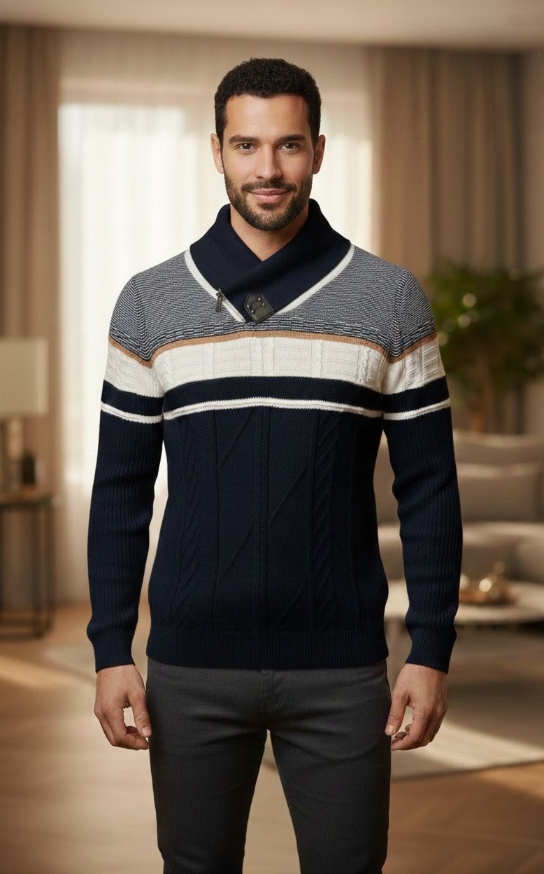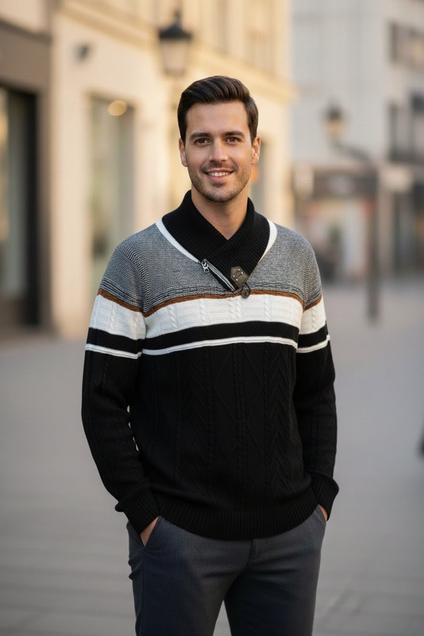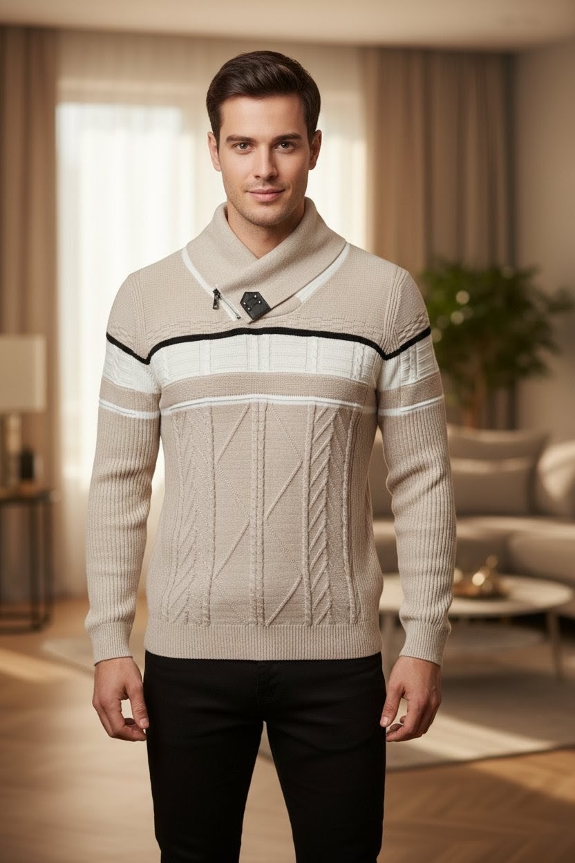 Jersey de punto fino con cuello cruzado. Detalle de botón y cremallera en el cuello. Tejido con estructura, franjas y ochos. Este producto talla muy pequeño. Se aconseja coger una talla más de la que se suele usar para un ajuste entallado y dos tallas más para un ajuste normal.