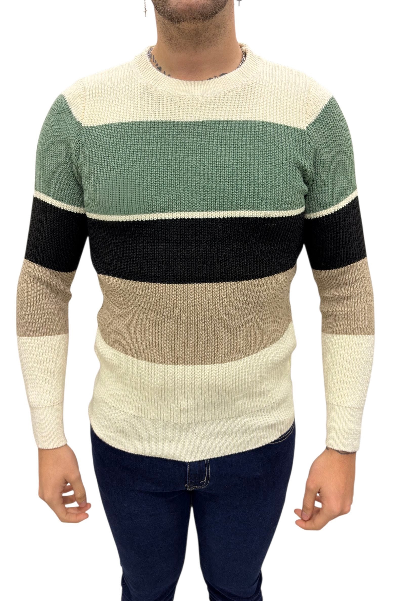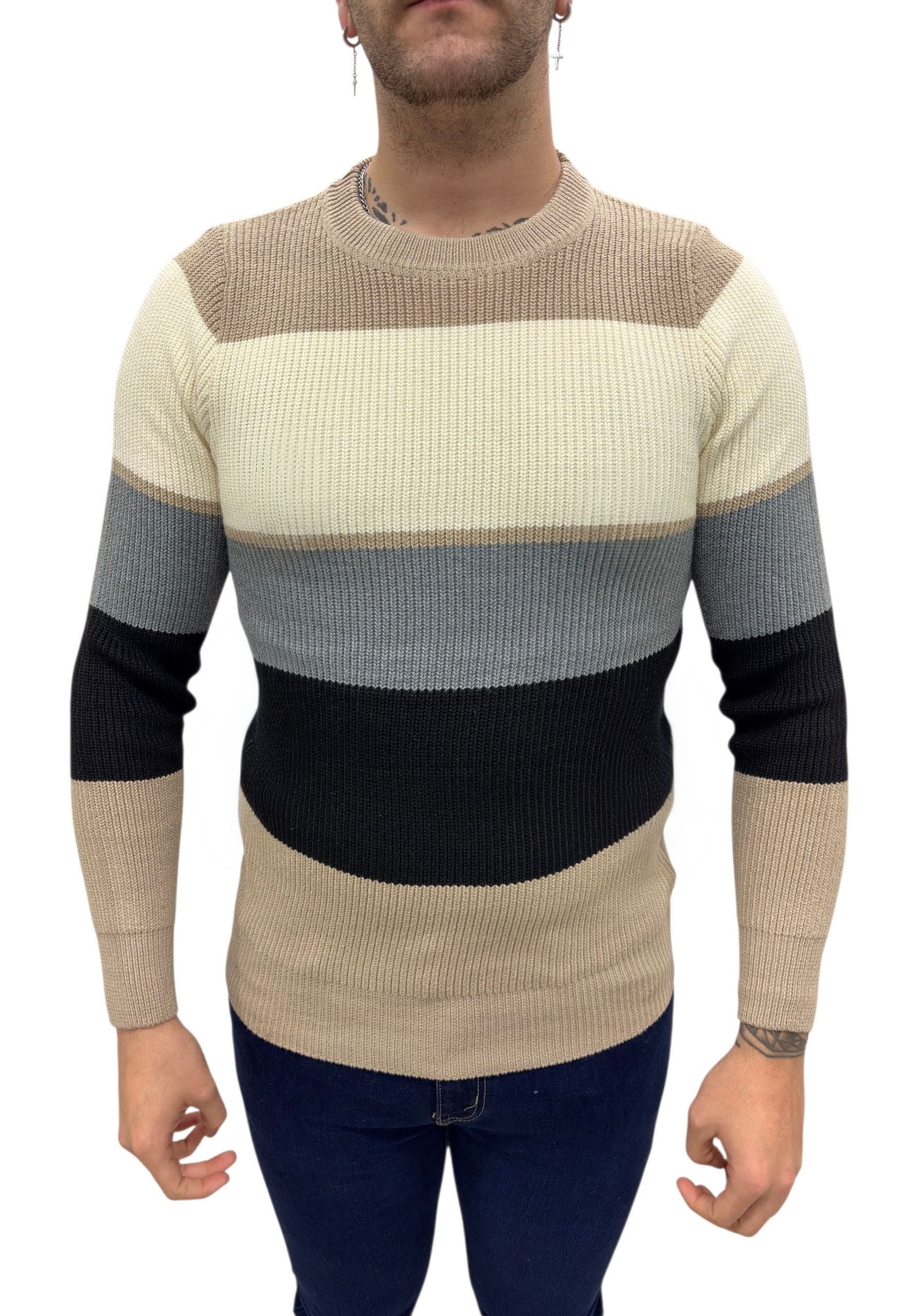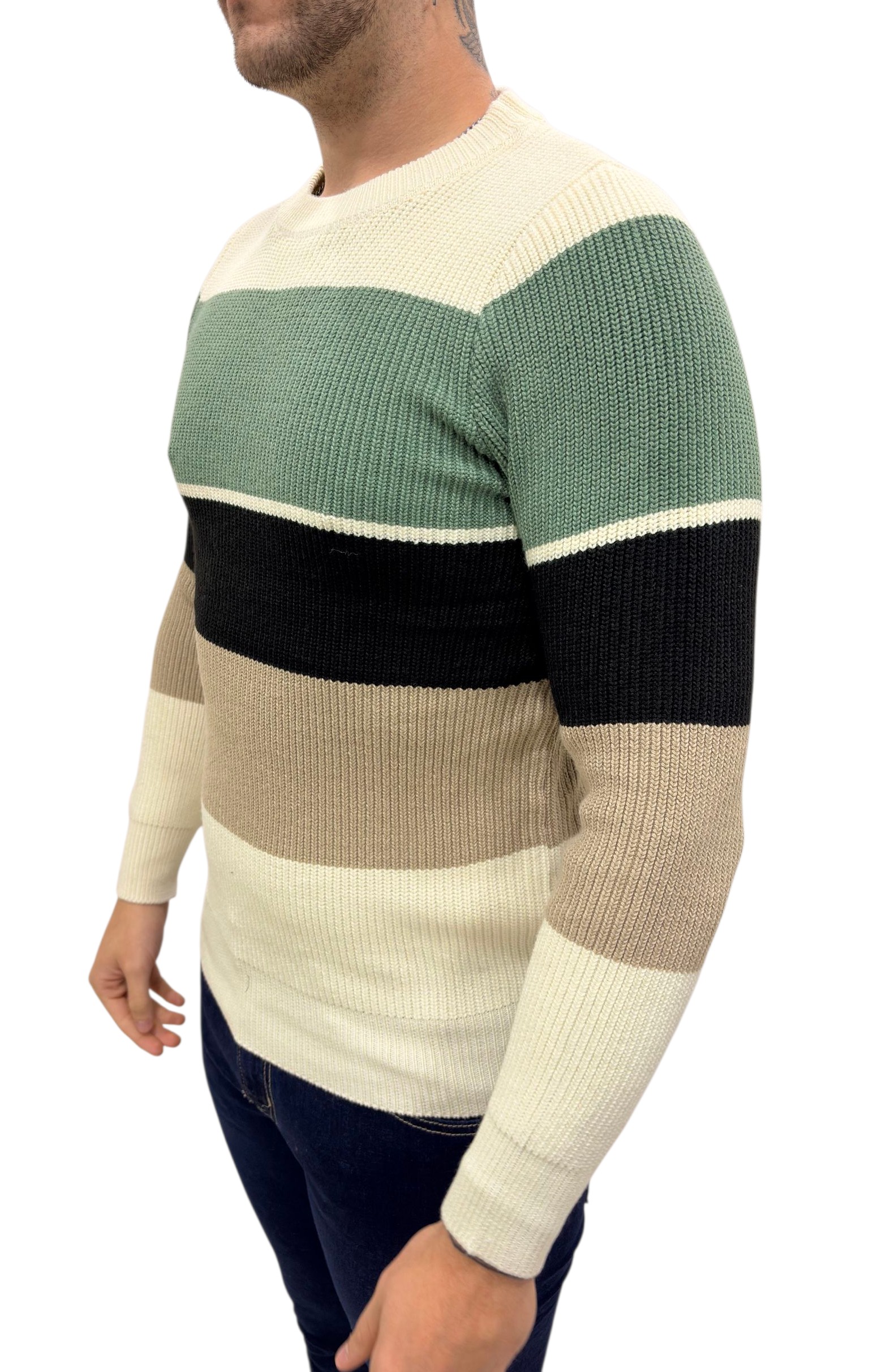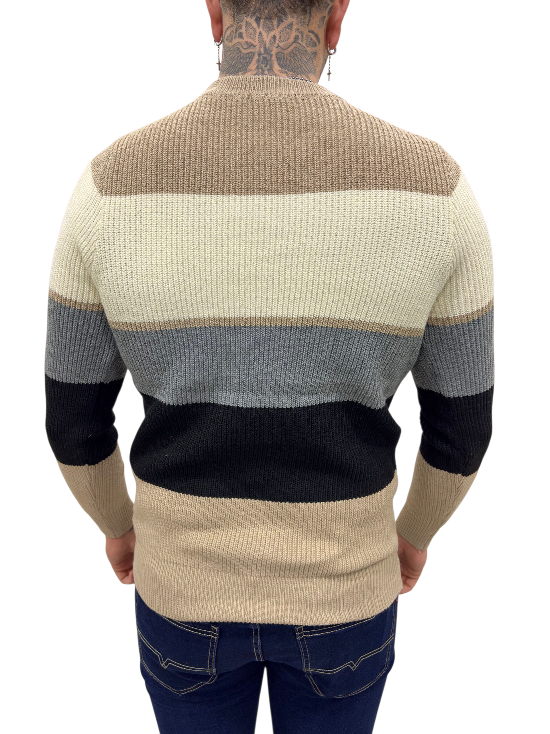 Jersey de punto gordo con franjas tricolor y cuello a la caja. Este producto talla más pequeño de lo habitual. Se aconseja coger una talla más de la que suele usar.
