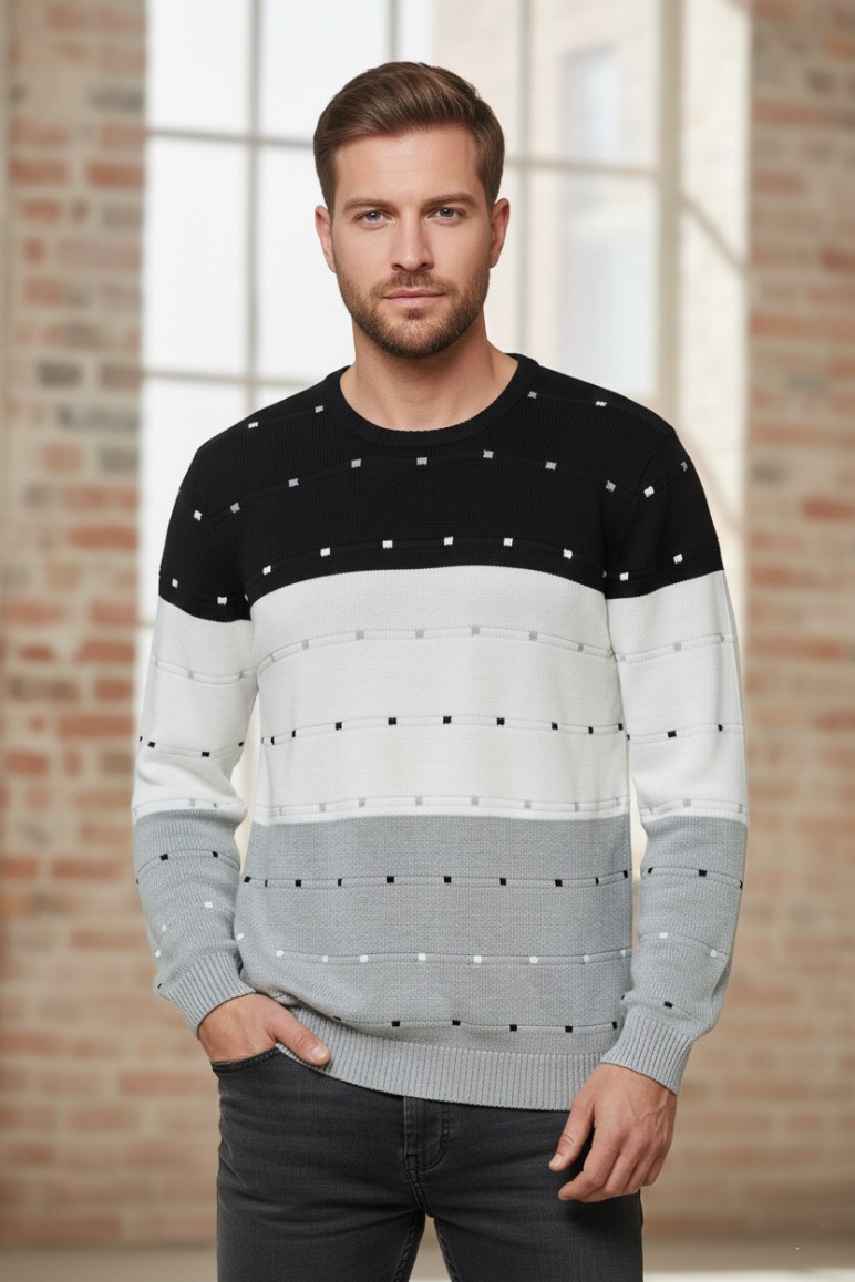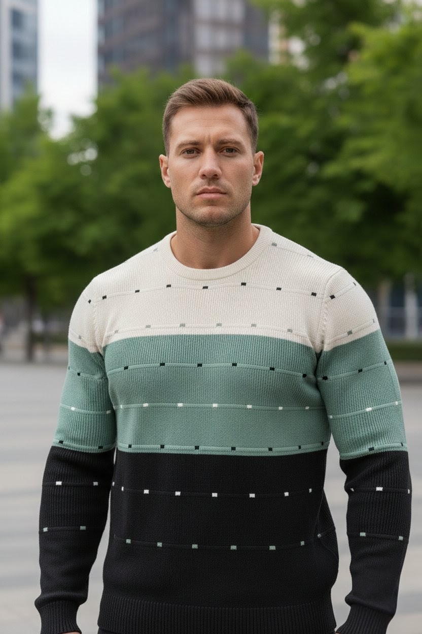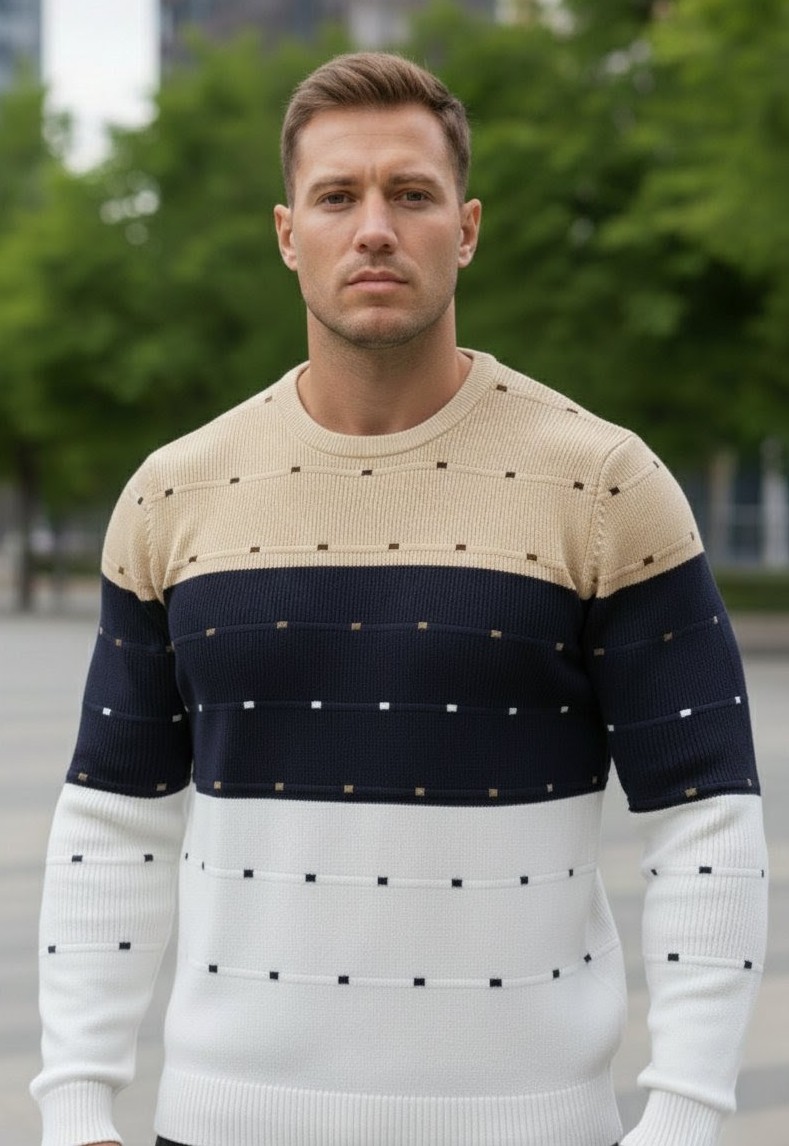 Jersey de punto gordo con franjas tricolor y cuello a la caja. Detalle de cuadritos en colores. Este producto talla más pequeño de lo habitual. Se aconseja coger una talla más de la que suele usar.