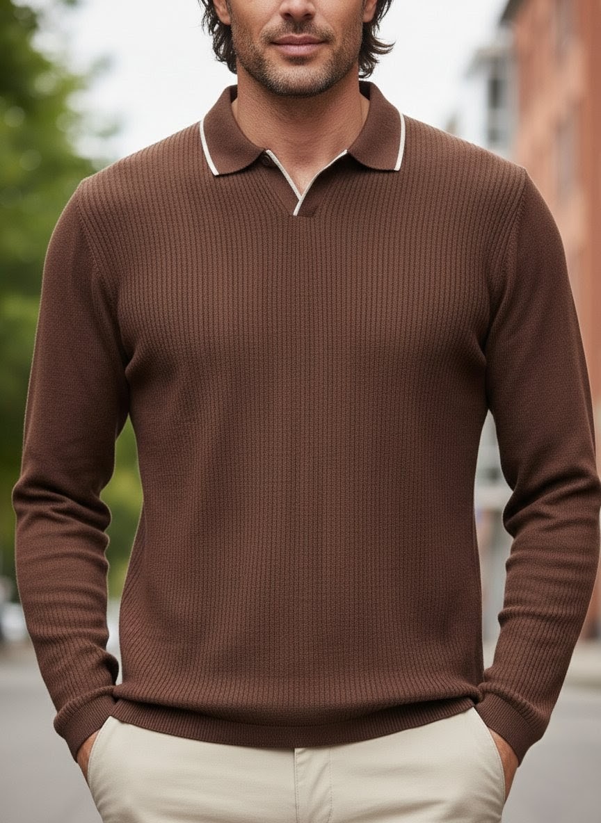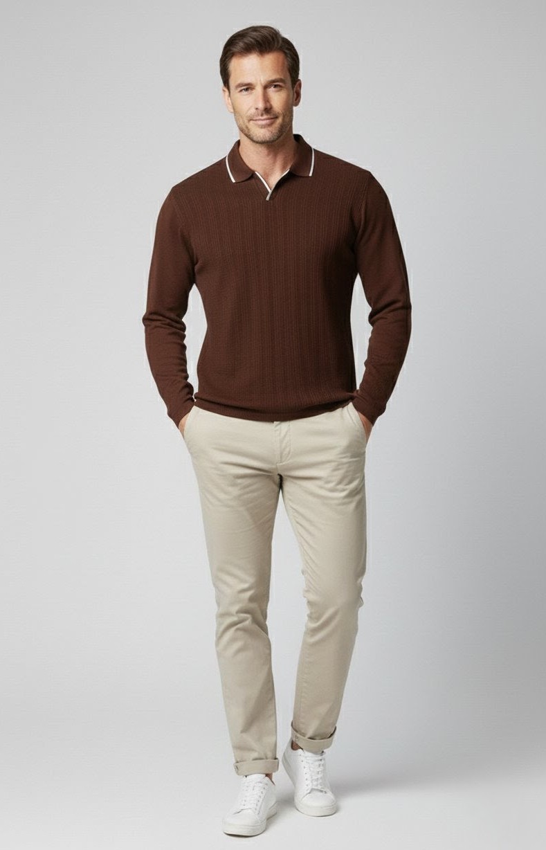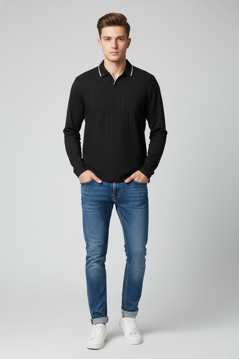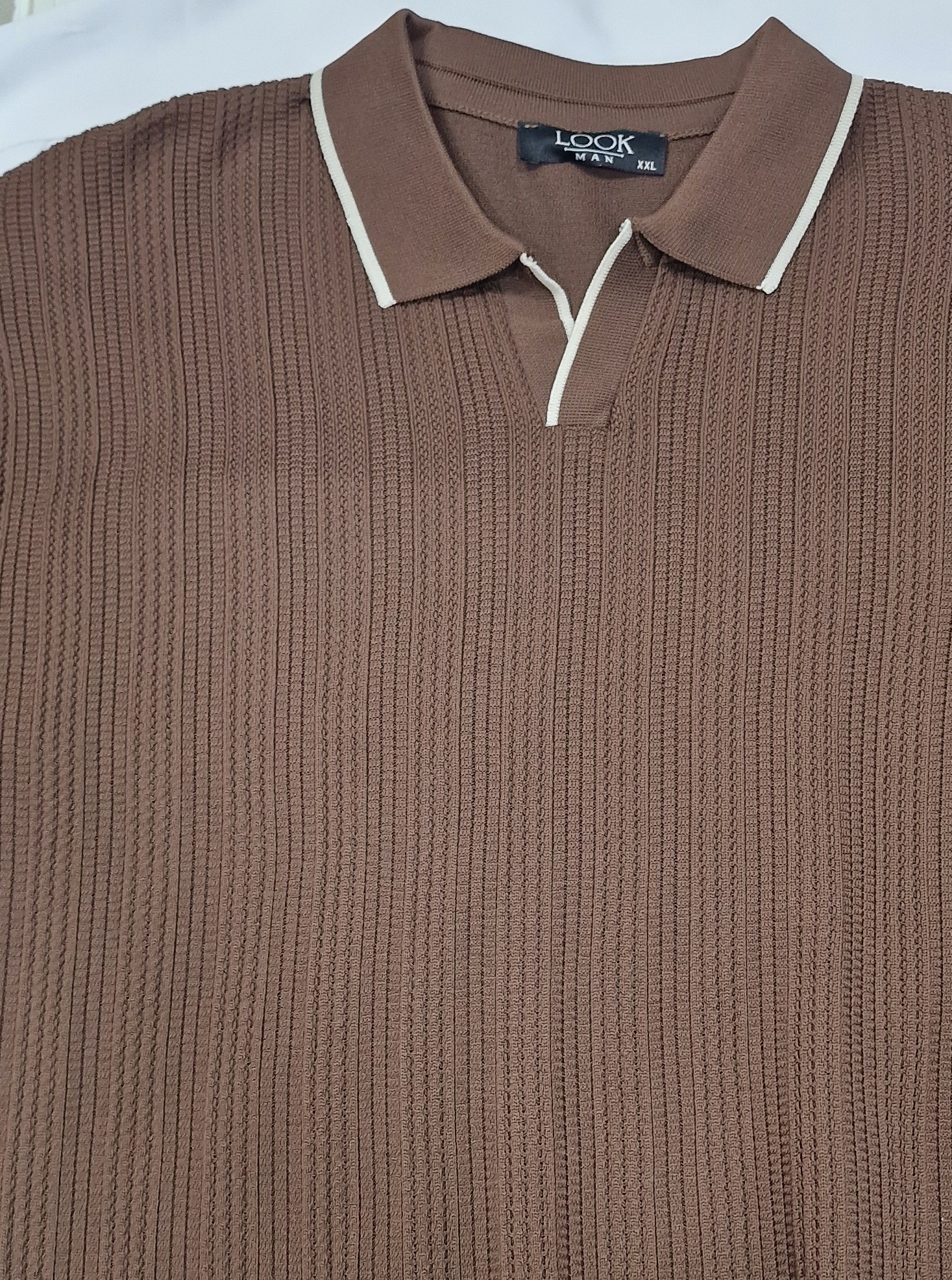 Polo de punto fino con tejido con estructura y detalle filo blanco en el cuello. Cuello abierto. Este producto talla más grande de lo habitual. Se recomienda coger una talla inferior a la que suele usar.