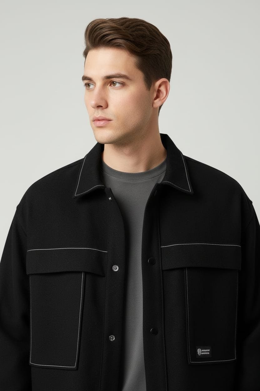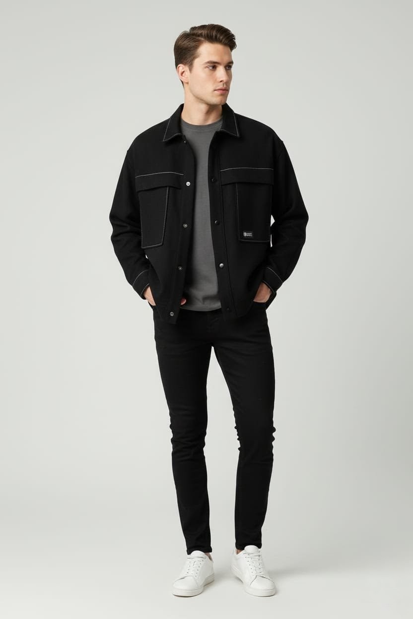 Sobrecamisa oversize en tejido tipo vaquero con detalle de pespuntes blancos. Botones tipo clic.