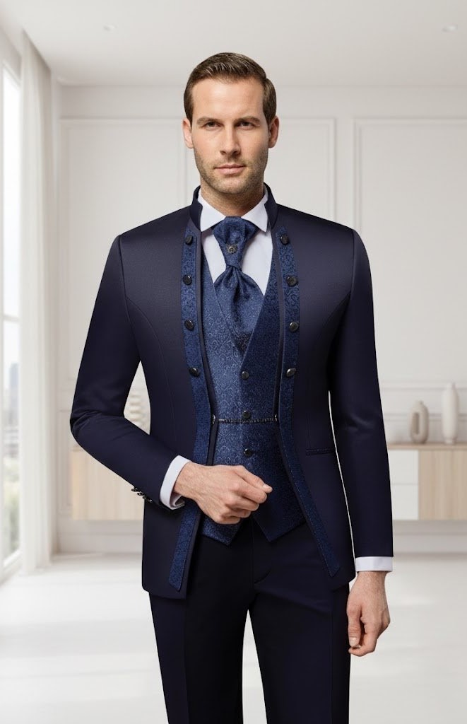 Este traje es ideal para novios que buscan la perfección en el equilibrio entre lo clásico y lo ornamental. El azul marino satinado proyecta una imagen de serenidad y lujo, perfecta para bodas de etiqueta donde el buen vestir es el protagonista.