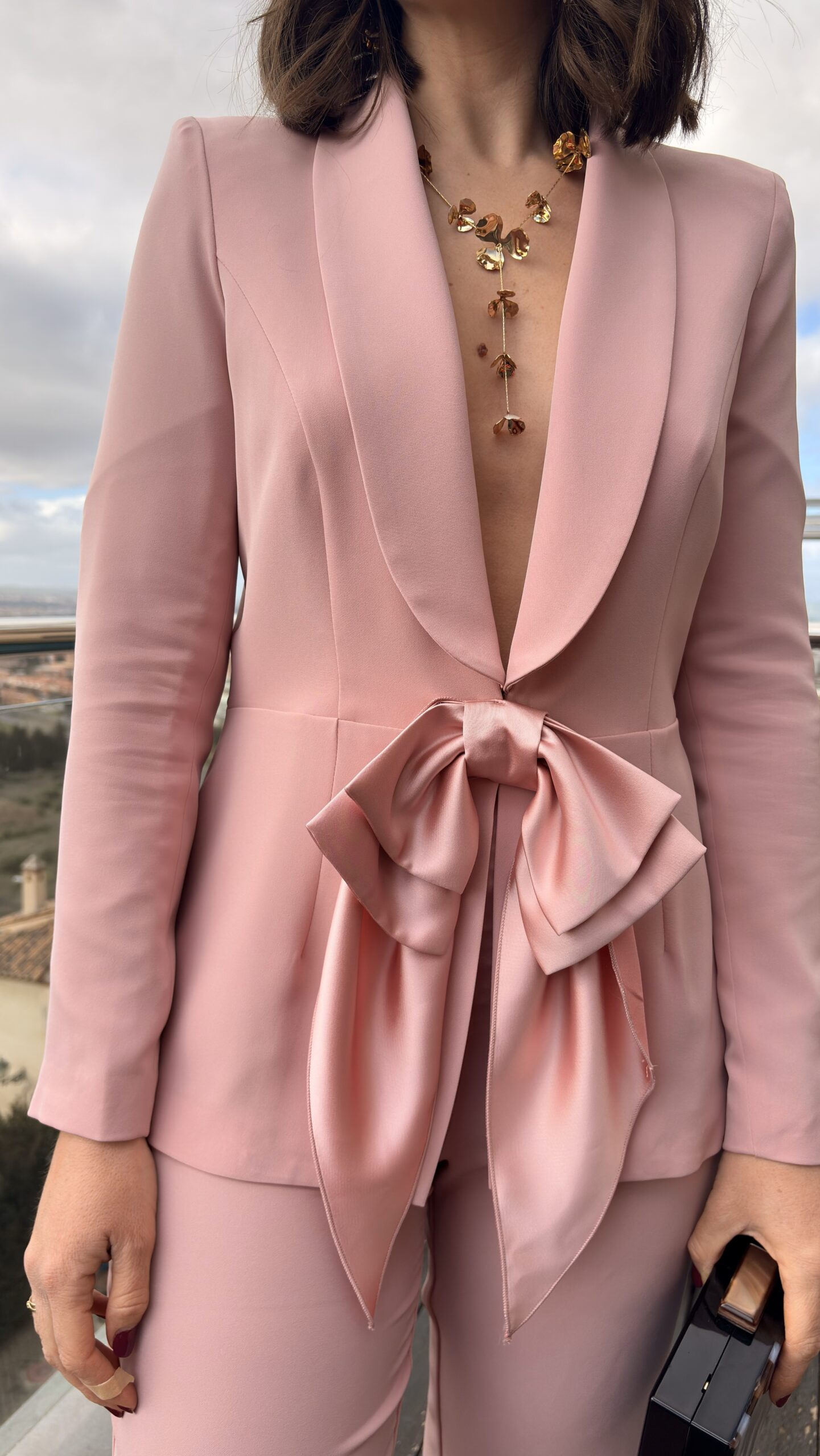 Conjunto chaqueta y pantalón con detalle de moña. Disponible en color blanco y rosa palo.