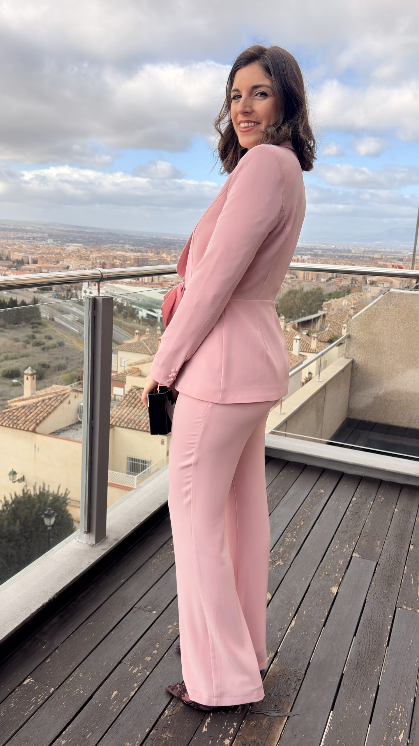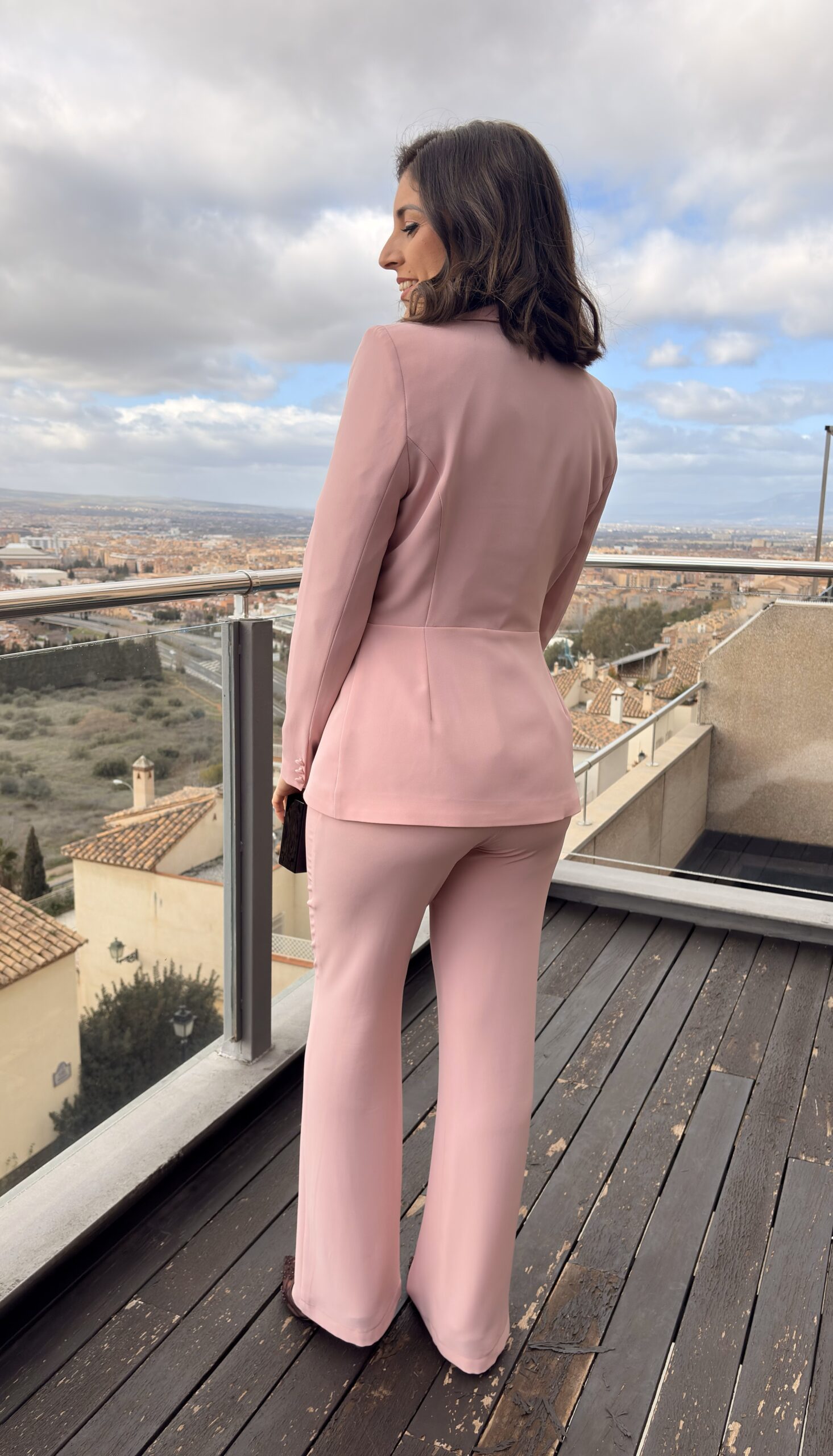 Traje de dos piezas de mujer, chaqueta y pantalón. Disponible en dos colores: blanco y rosa palo. Chaqueta con solapa redondeada, botón interior y botón invisible debajo de la moña. Pantalón recto, un poco acampanado, de tiro alto con cremallera invisible en el lateral. Diseñado y fabricado en España.