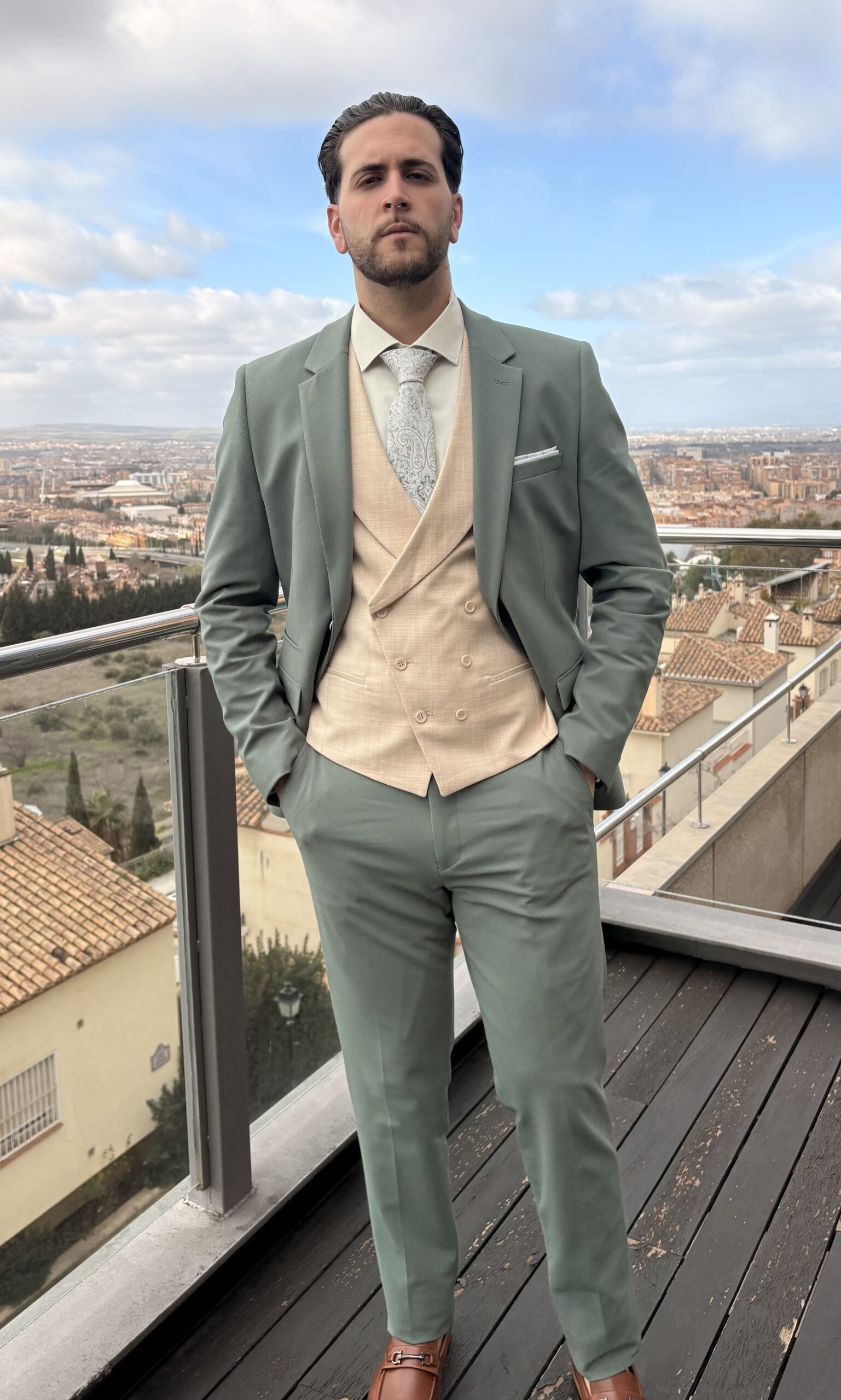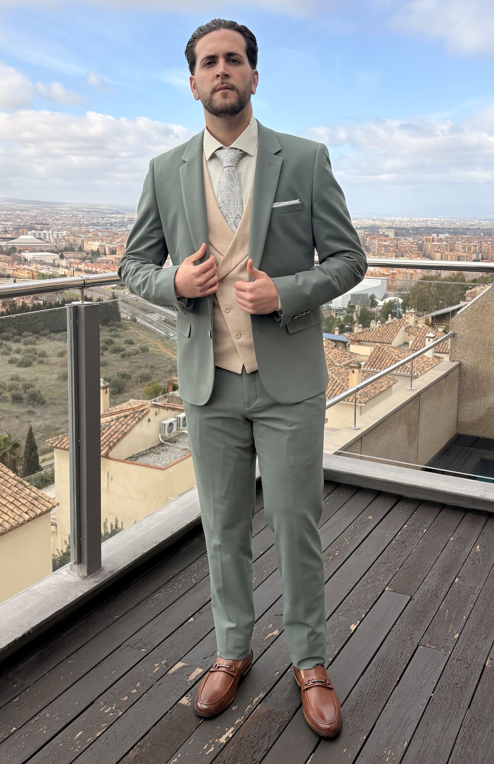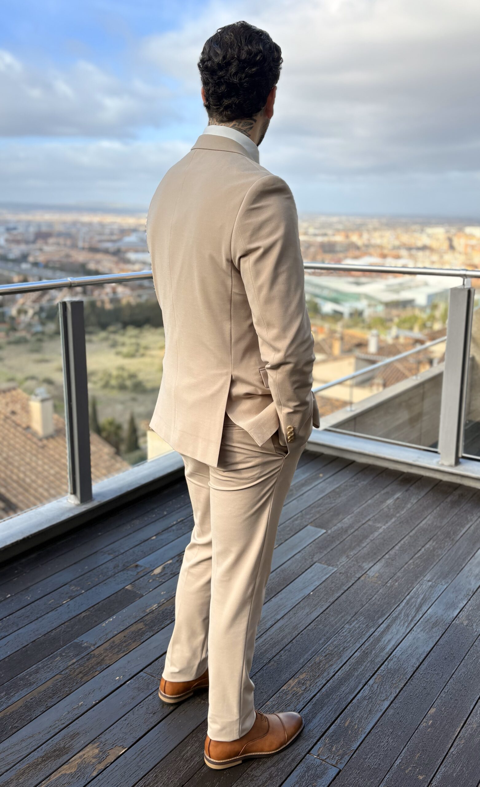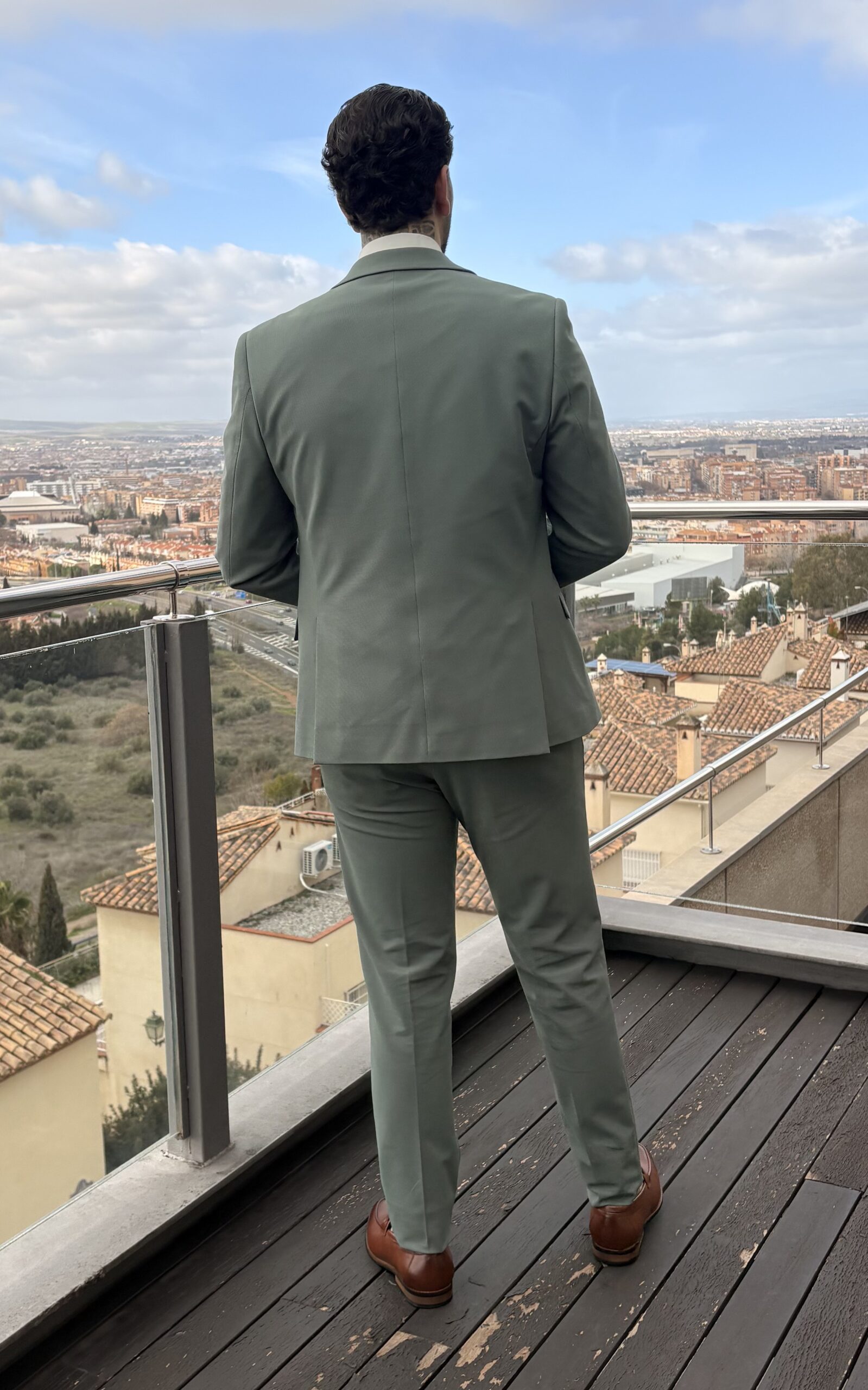 Traje entallado con licra, de dos piezas, chaqueta y pantalón, disponible en varios colores: azul marino, azul cobalto, beige y verde aceituna.