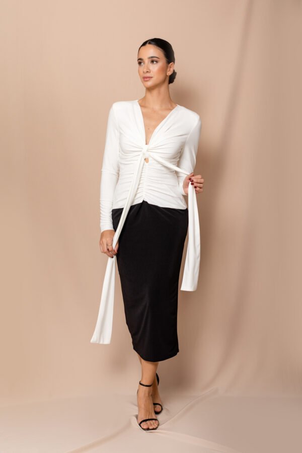 Vestido bicolor con detalle de lazada en el escote y frunces. Escote en pico y manga larga. Tejido punto, elástico, con forro, hombreras y cremallera invisible en la espalda. Disponible en dos colores: blanco con negro, y nude con marrón. Diseñado y fabricado en España.
