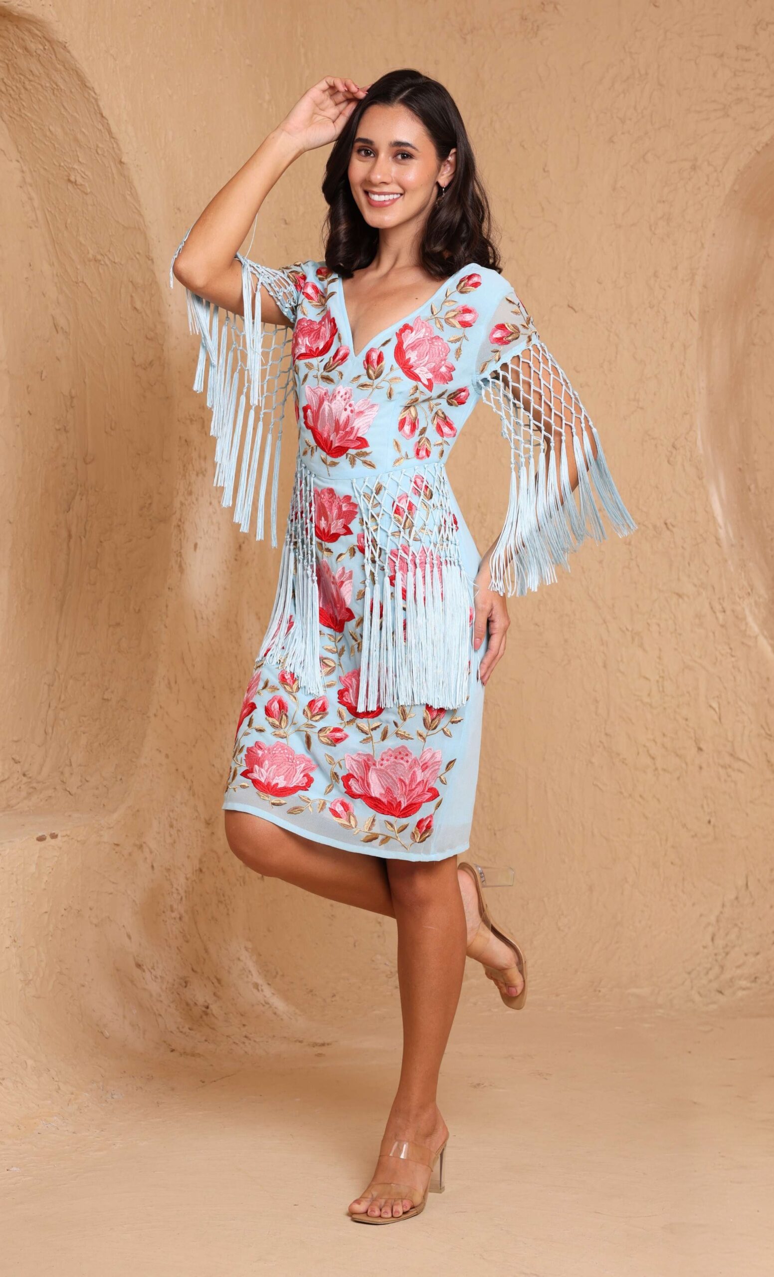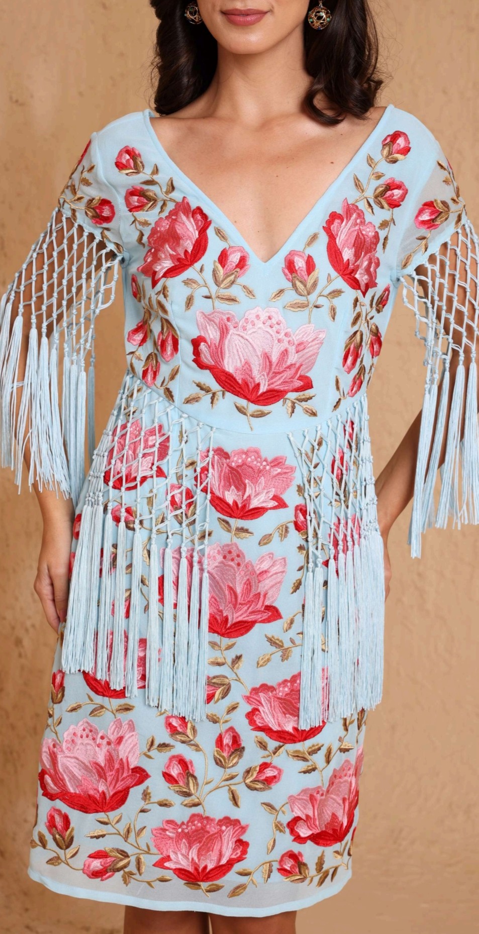 Vestido bordados mantón de manila manga corta celeste