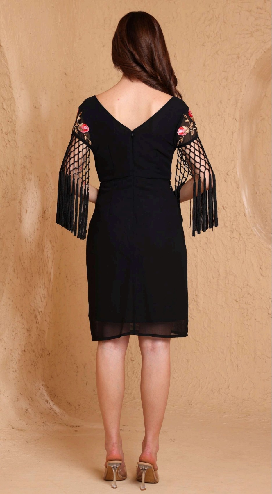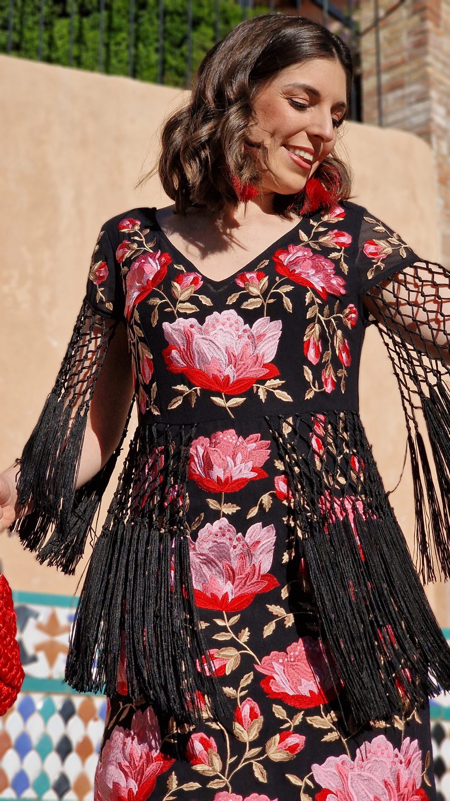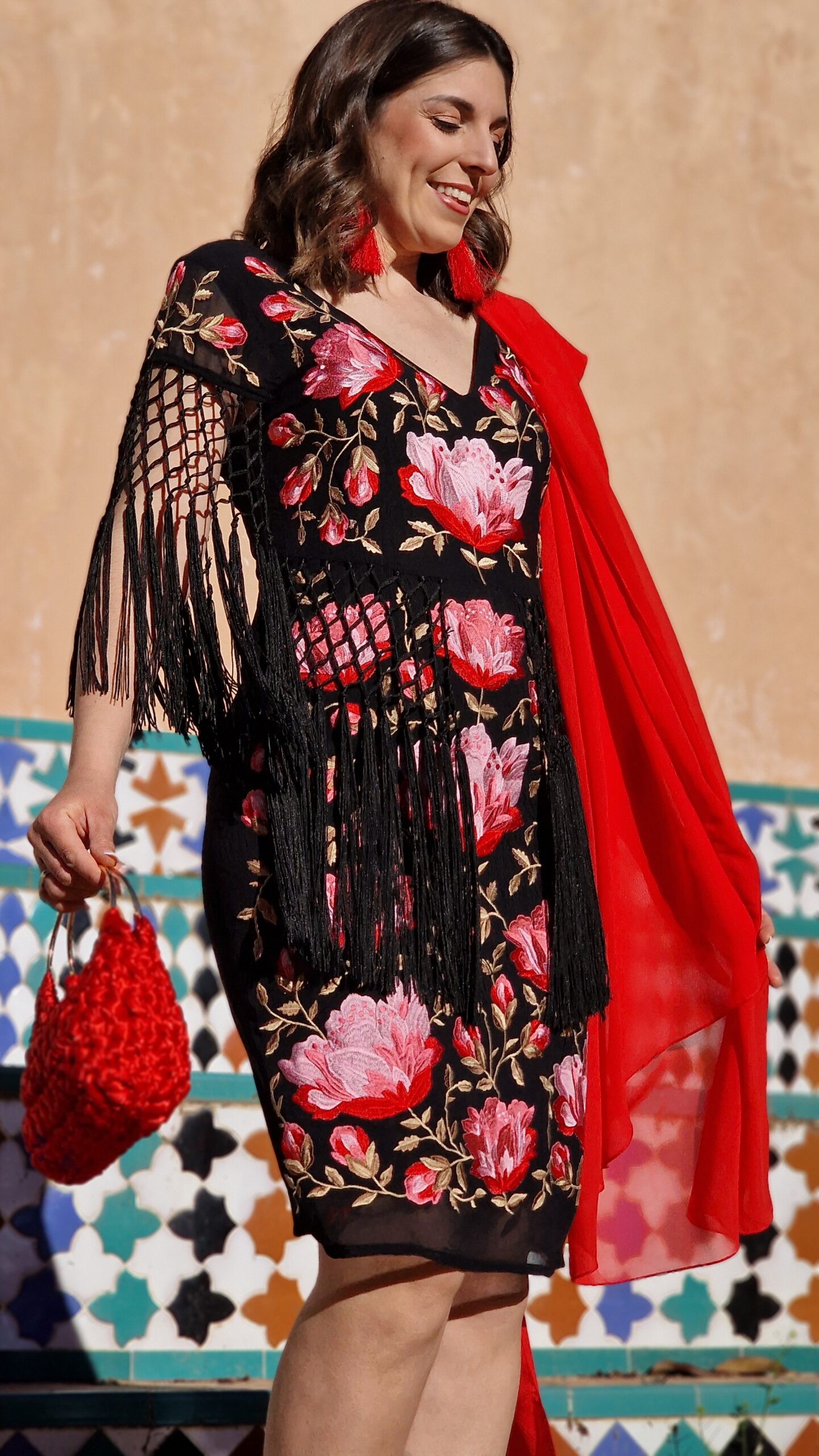 Vestido bordados mantón de manila manga corta negro