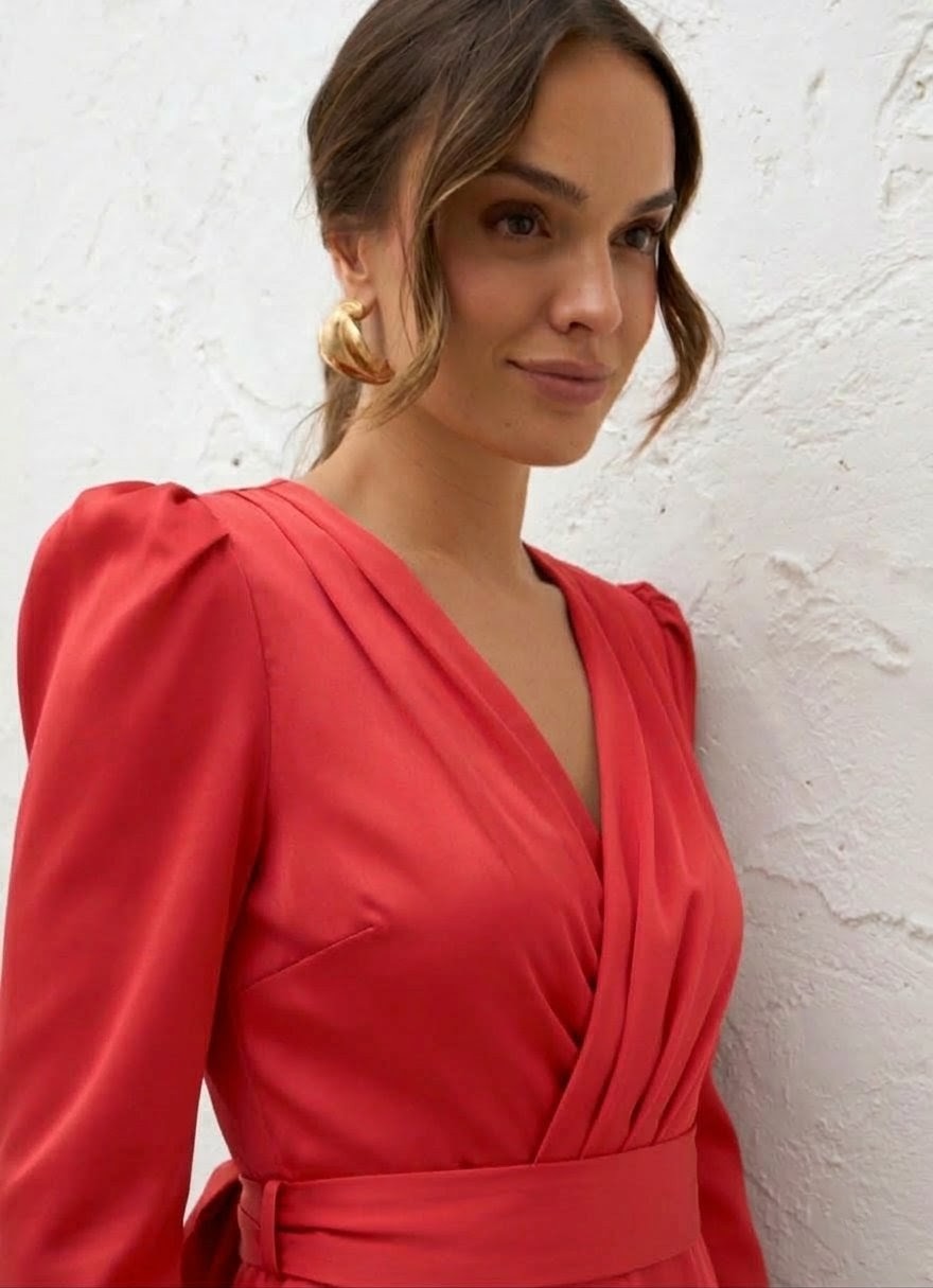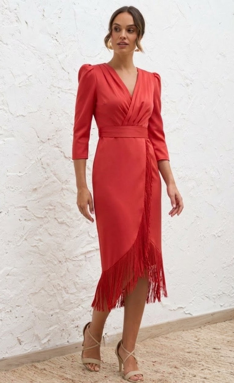 Vestido cruzado bajo flecos rojo