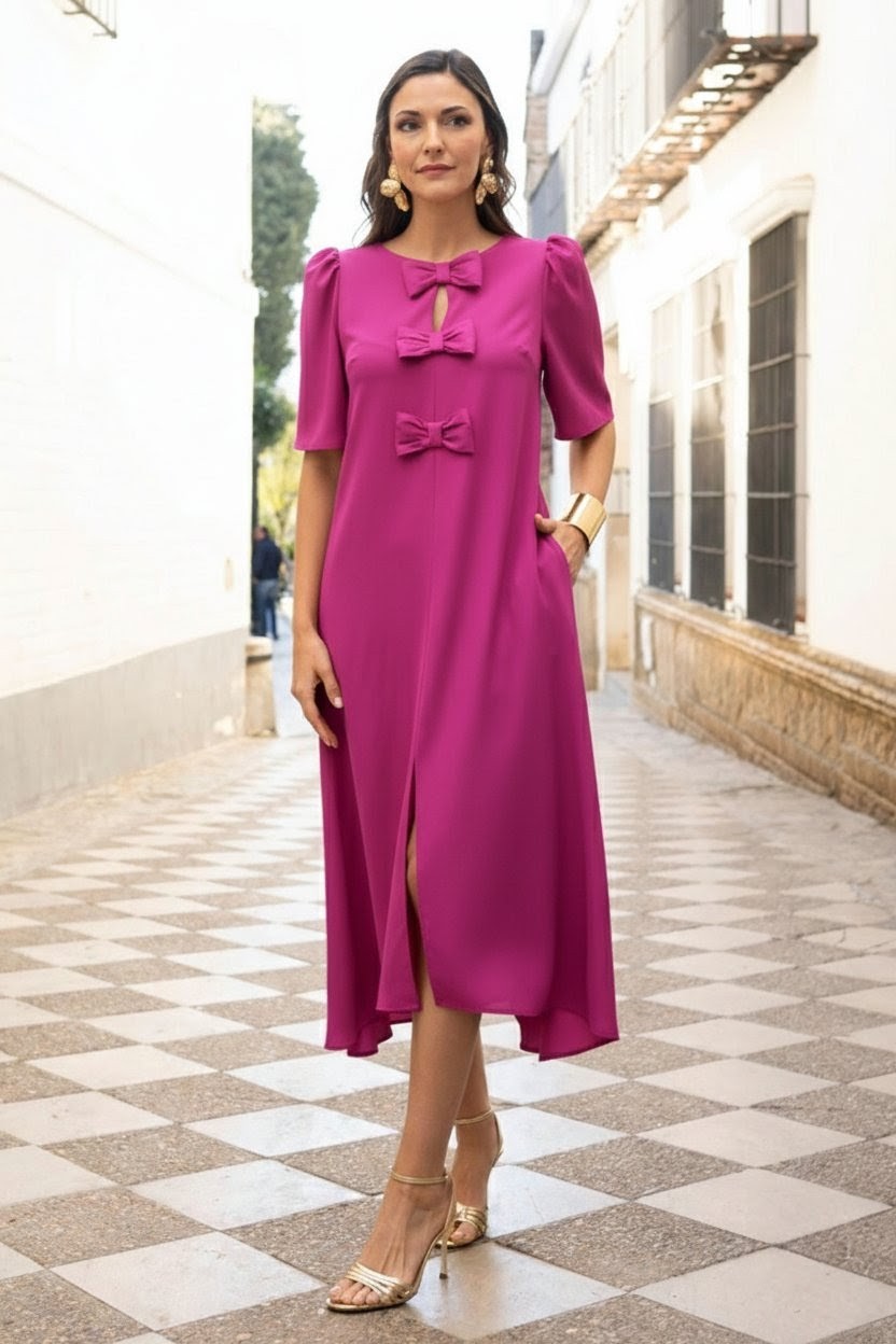 Vestido suelto y fluido tipo kaftan con abertura frontal en la falda. Mangas abullonadas, abertura tipo gota en el escote y detalle de tres lazos. Disponible en color fucsia. Diseñado y fabricado en España.