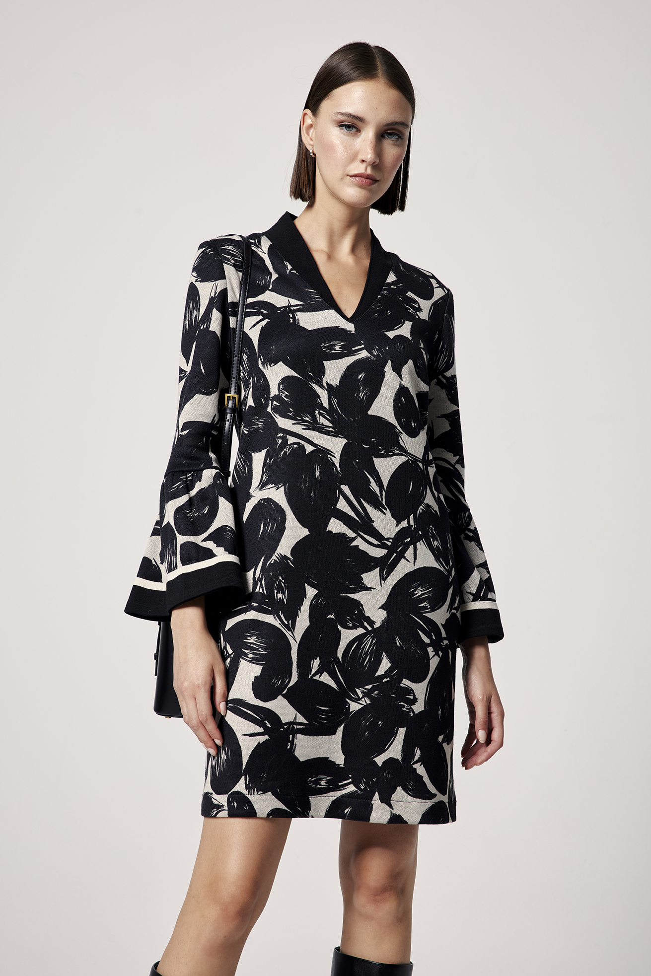 Vestido estampado hojas crudo y negro manga acabada en volante
