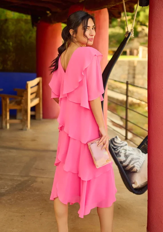 Vestido gasa corto volantes cruzados escote volantes rosa