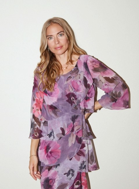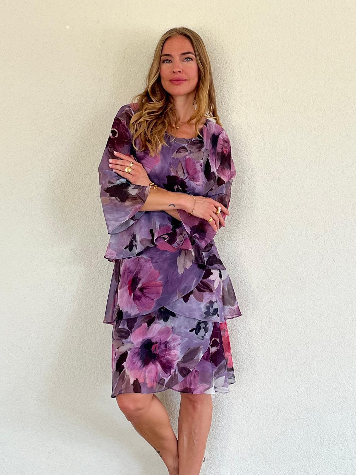 Vestido gasa corto volantes cruzados estampado floral tonos morados