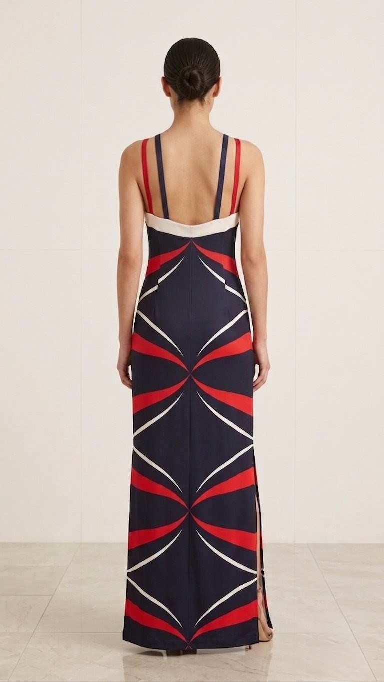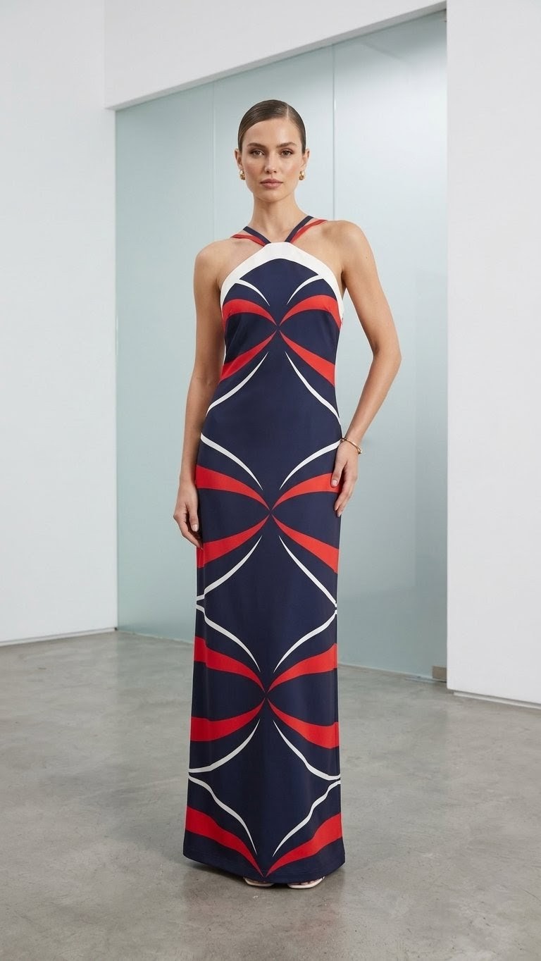 Vestido largo de corte halter con doble tirante en tonos azul marino y rojo. Vestido en color azul marino, con estampado de líneas en color rojos y blanco. Detalle de franja en color blanco en el escote. Aberturas laterales en el bajo del vestido. Cremallera invisible en la espalda. Tejido con caída y un poco de elastano. Forrado. Diseñado y fabricado en España.