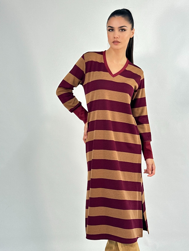 Vestido punto rayas camel y burdeos